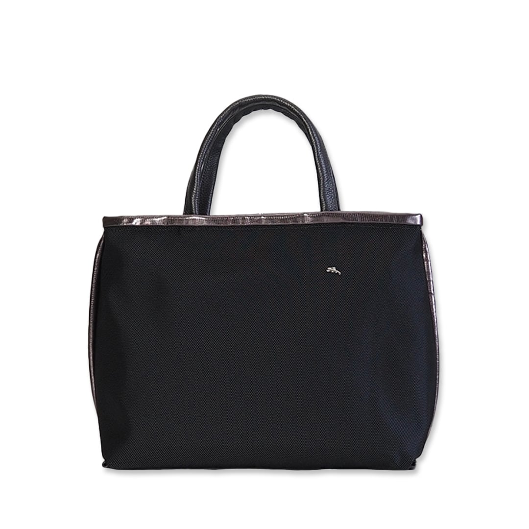 メタリックレザーのハンドルとも相まって、抜け感のあるグレー寄りの黒バッグに仕上がりました。