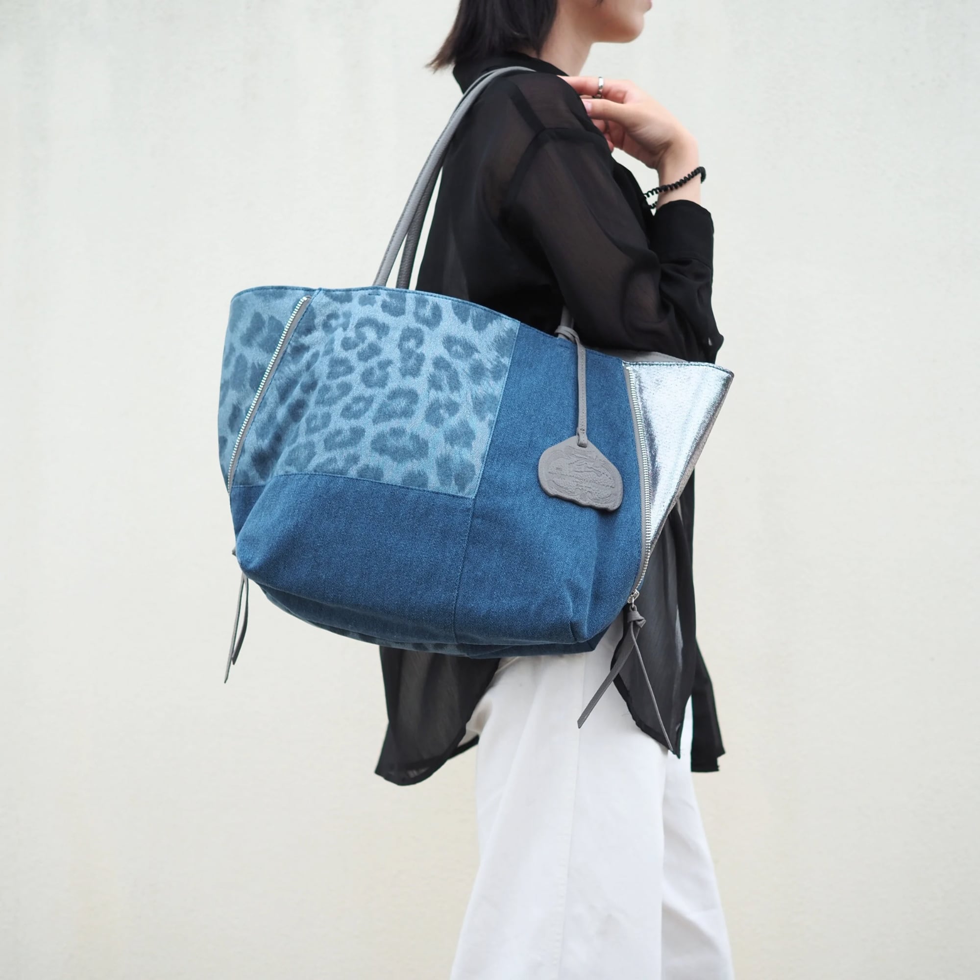2種類(無地のネイビー/ブルーのヒョウ柄)の軽量なデニム素材を、アシンメトリーにデザインしたトートバッグ。
