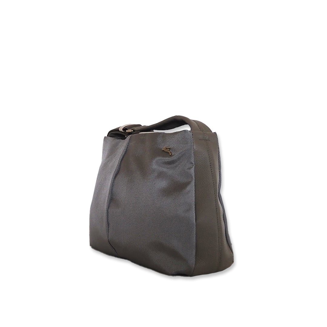 軽量で扱いやすい人気のポリエステル素材(グレージュ)をメインに、マチとショルダーの一部に配した同系色のレザーが、シンプルなデザインのアクセントになっています。