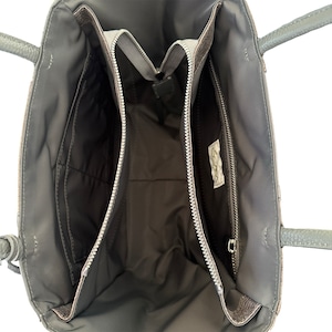 軽量のナイロンとグリッター素材を使用したシルバー&グレー系の絶妙な配色がスタイリッシュなトートバッグ。