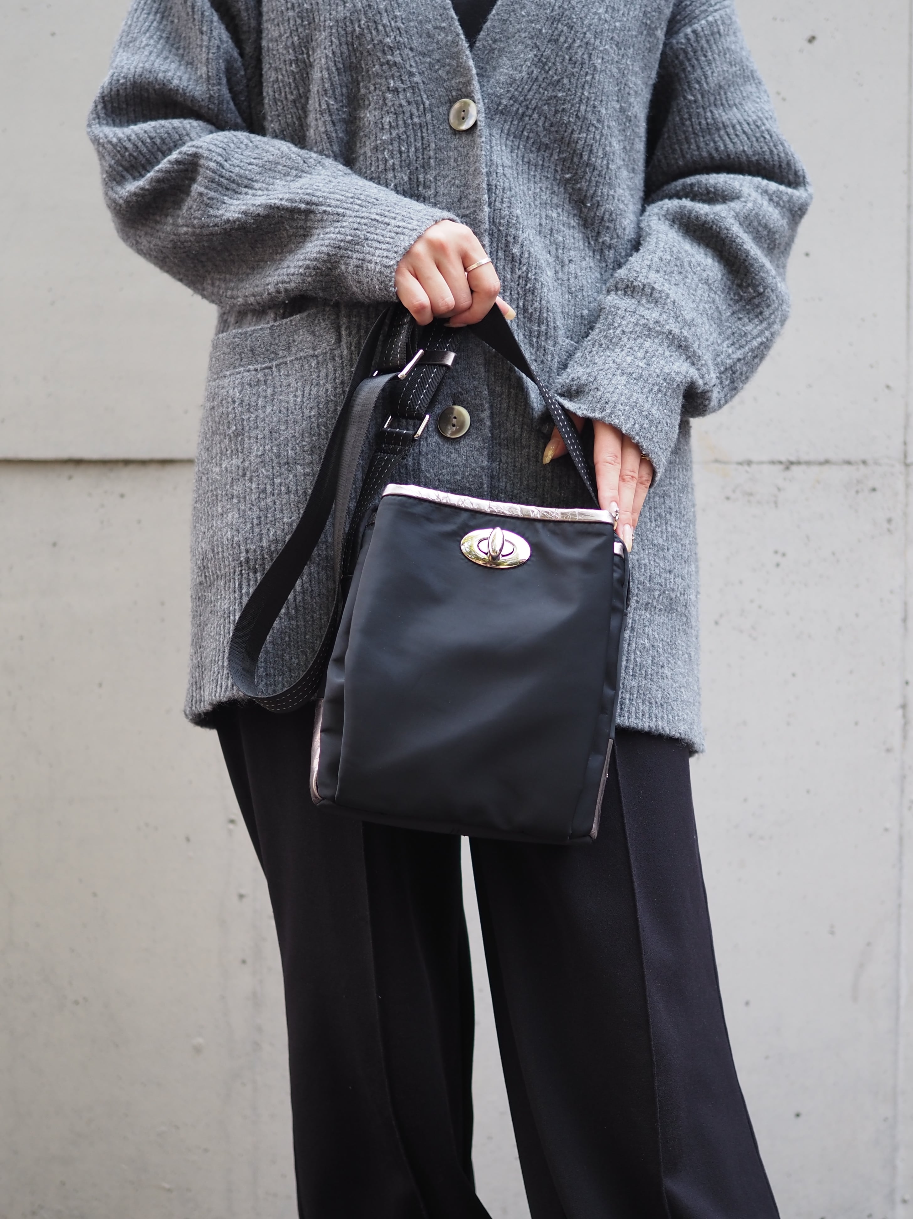 一見シンプルなフォルム、しかしながらフロントポケットの口周りとマチに配したメタリックレザーが、ひねり金具と共鳴するようなデザインになっています。