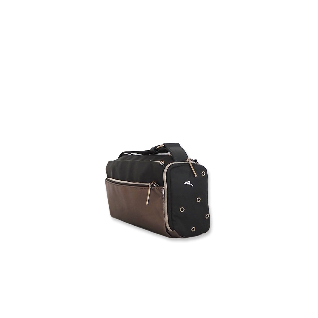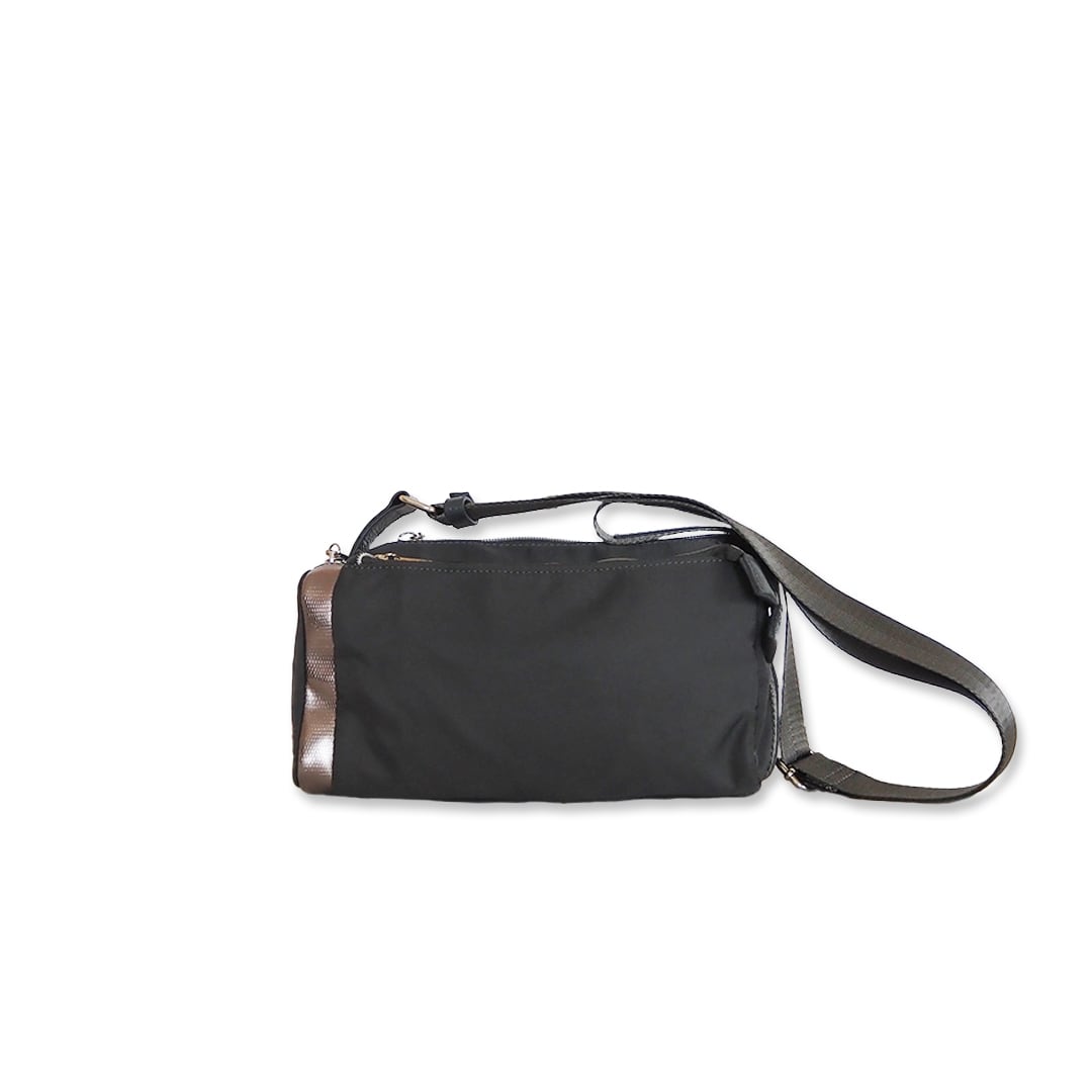リザード型押しを施したメタリックレザーと軽量のナイロン製のショルダーバッグ。