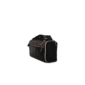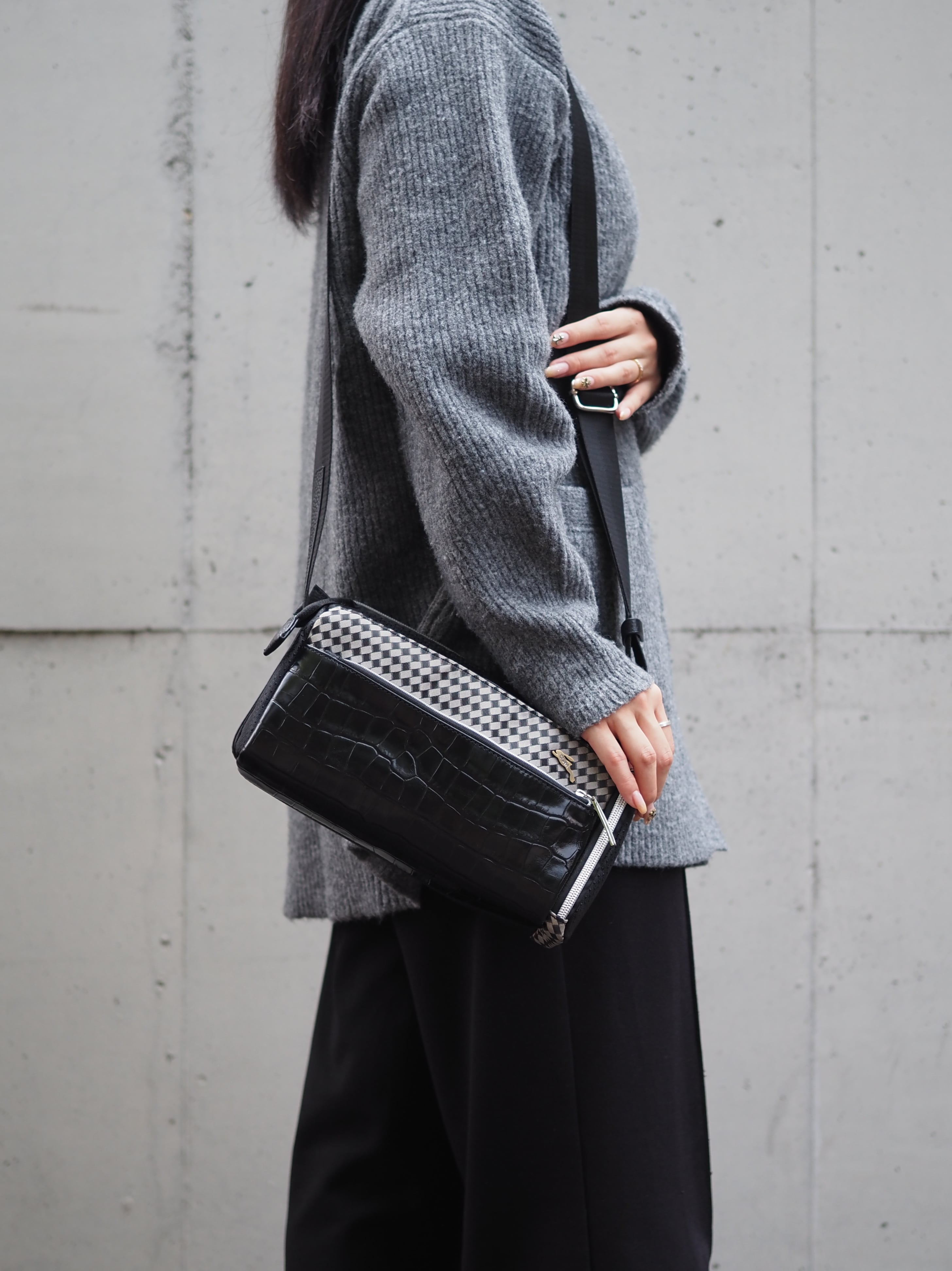 クロコ型押しを施したレザー(黒)に、軽量で大人気のオリジナルジャガード織(メッシュ柄)とポリエステル素材(黒)を組み合わせたショルダーバッグ。
