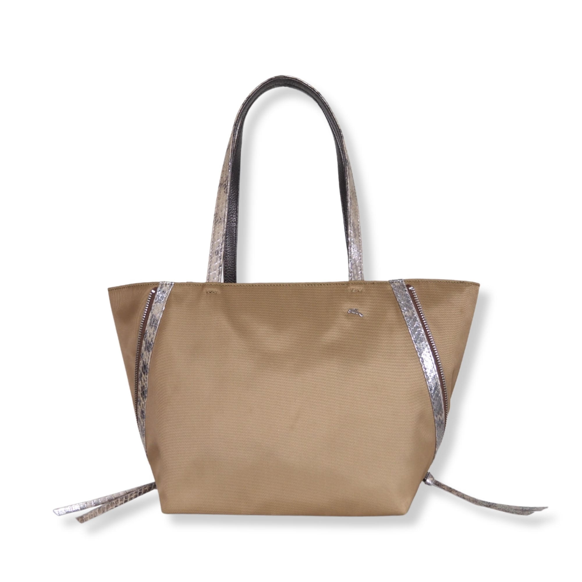 ツイルのナイロンとメタリックなヘビ皮革のマスタードカラーが新鮮