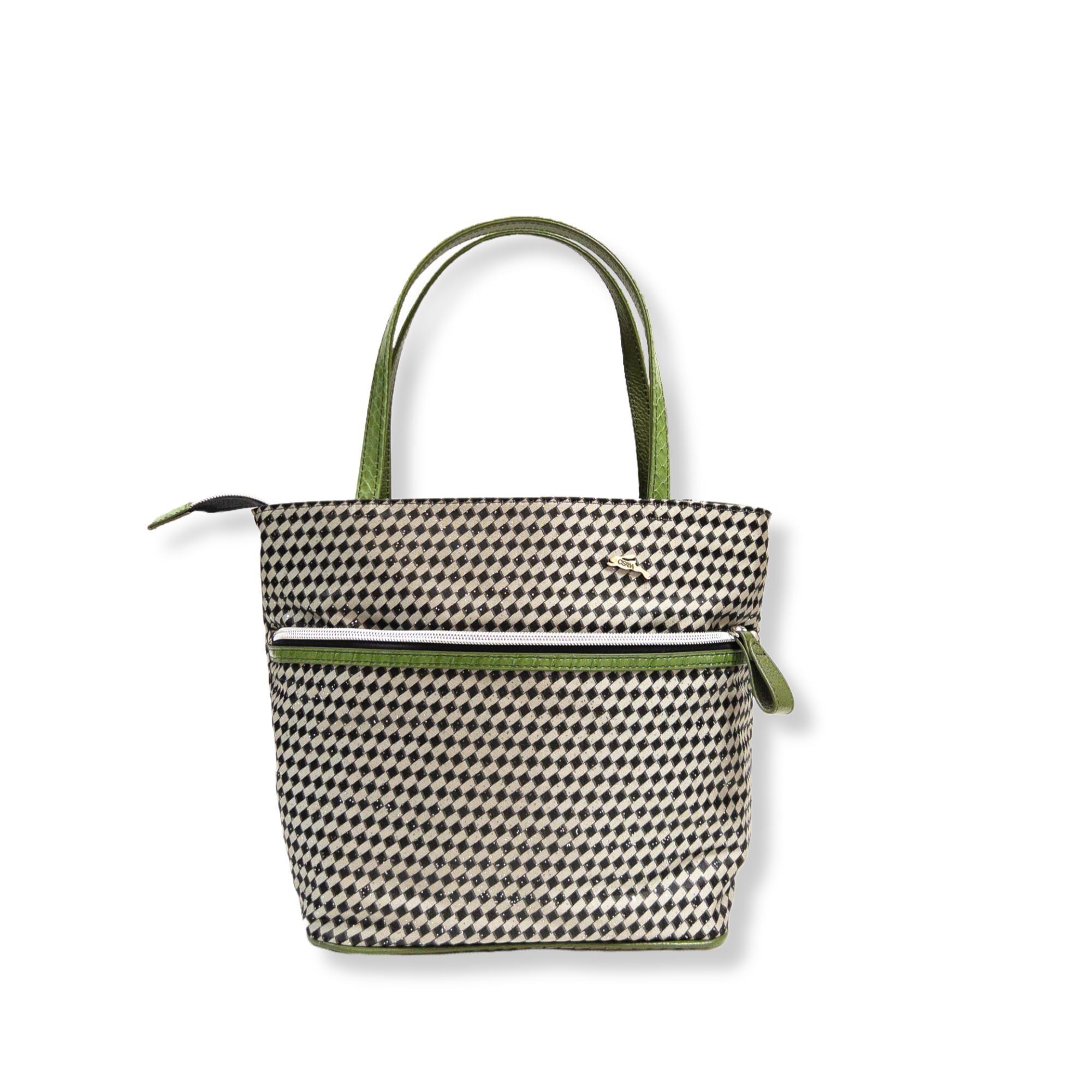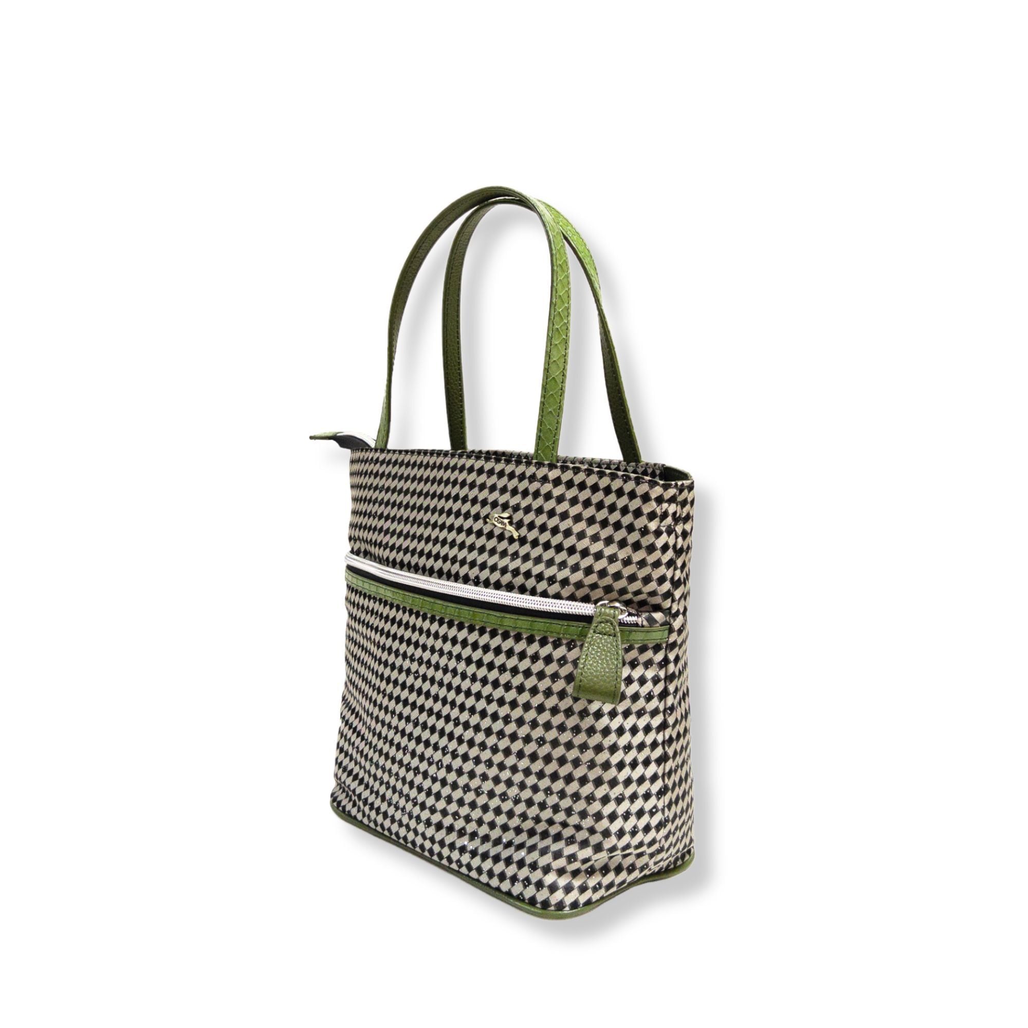 持ち手とファスナーラインに使用したヘビ皮革がポイント