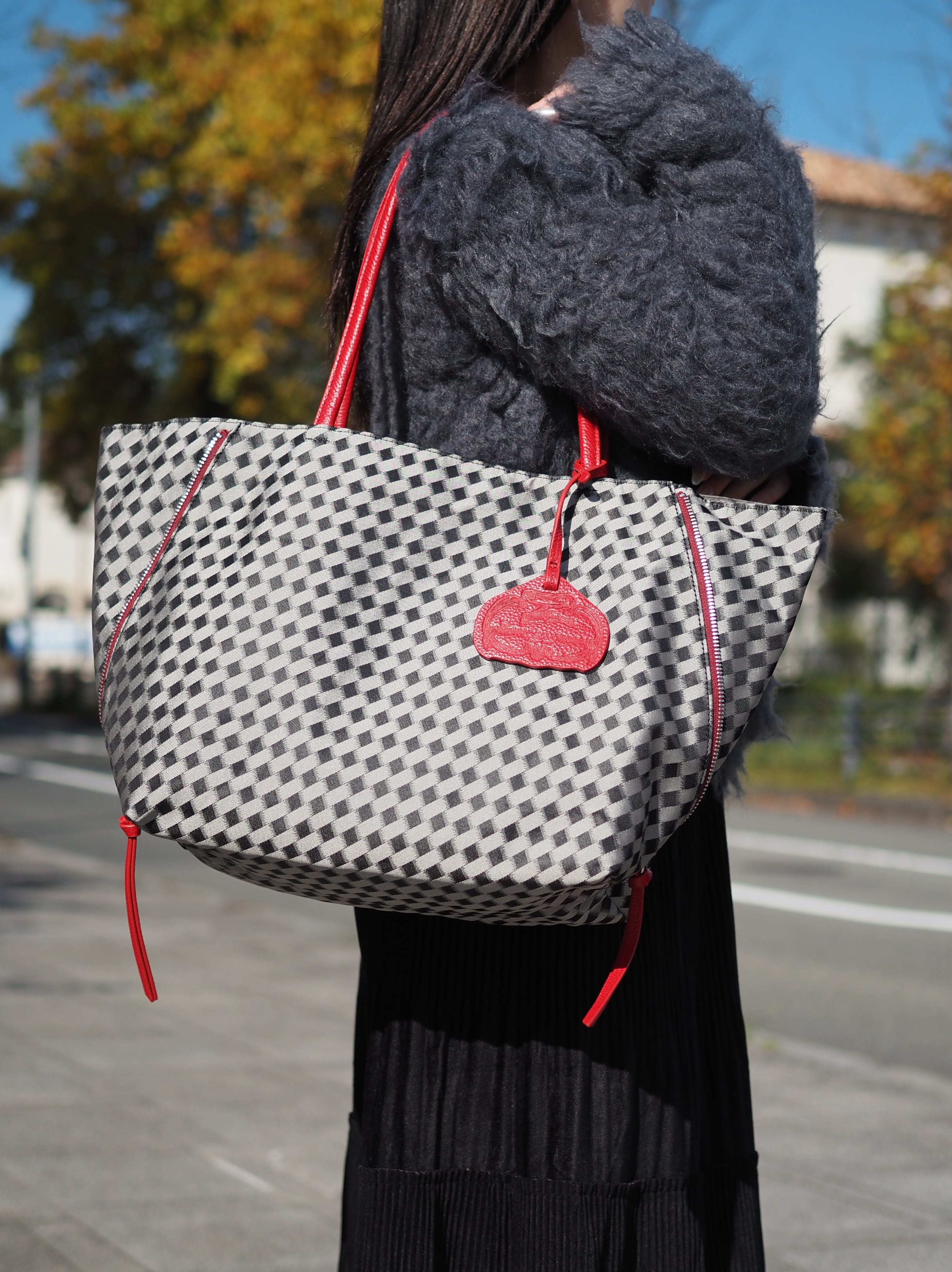 両サイドのファスナーの開閉によりサイズやフォルムが変化するので、シーンに合わせてお楽しみください。