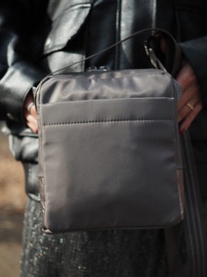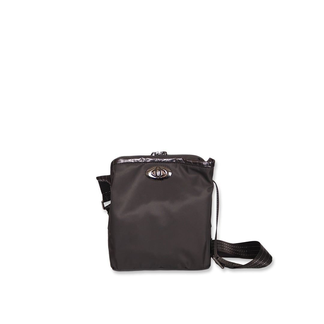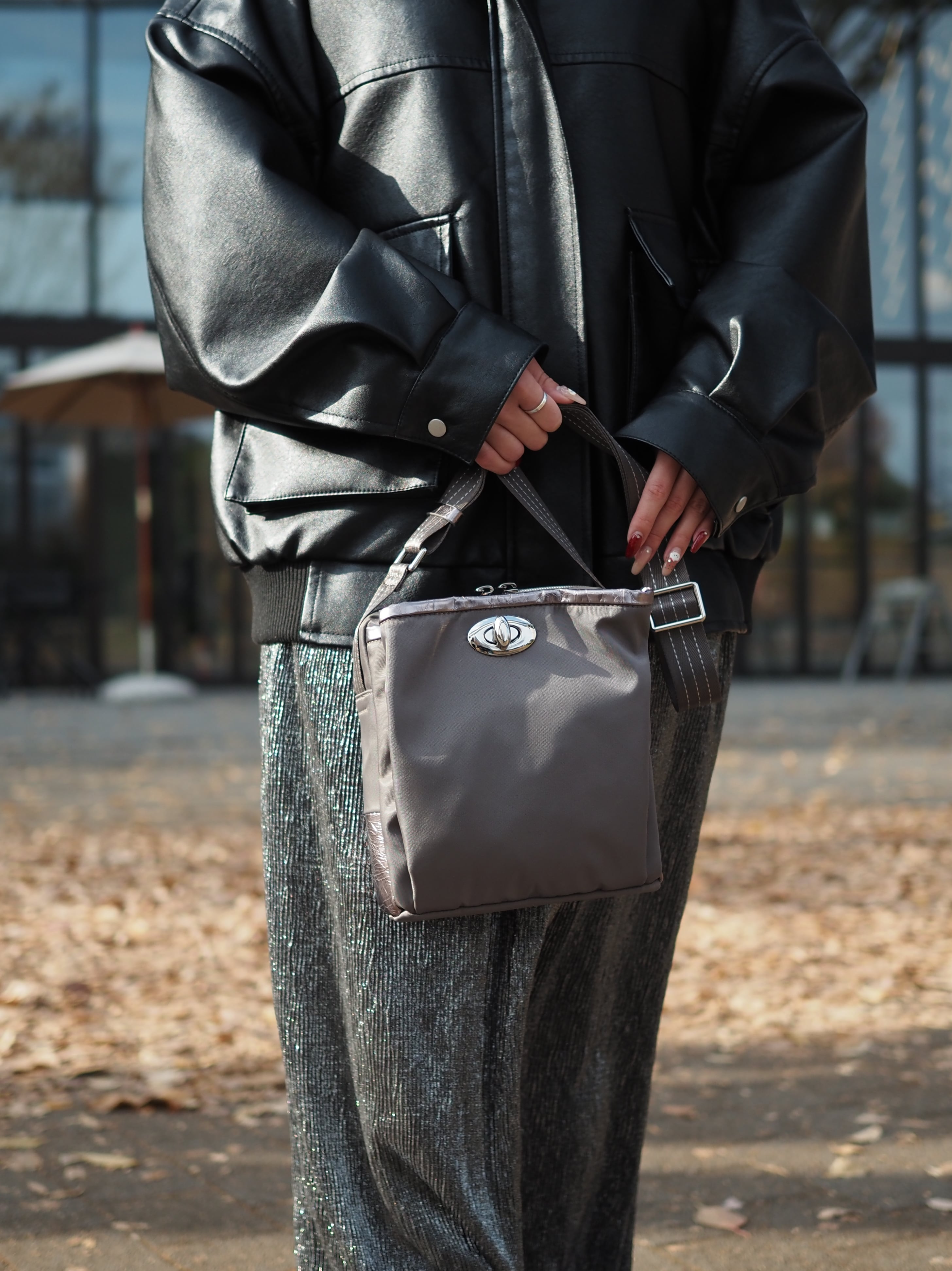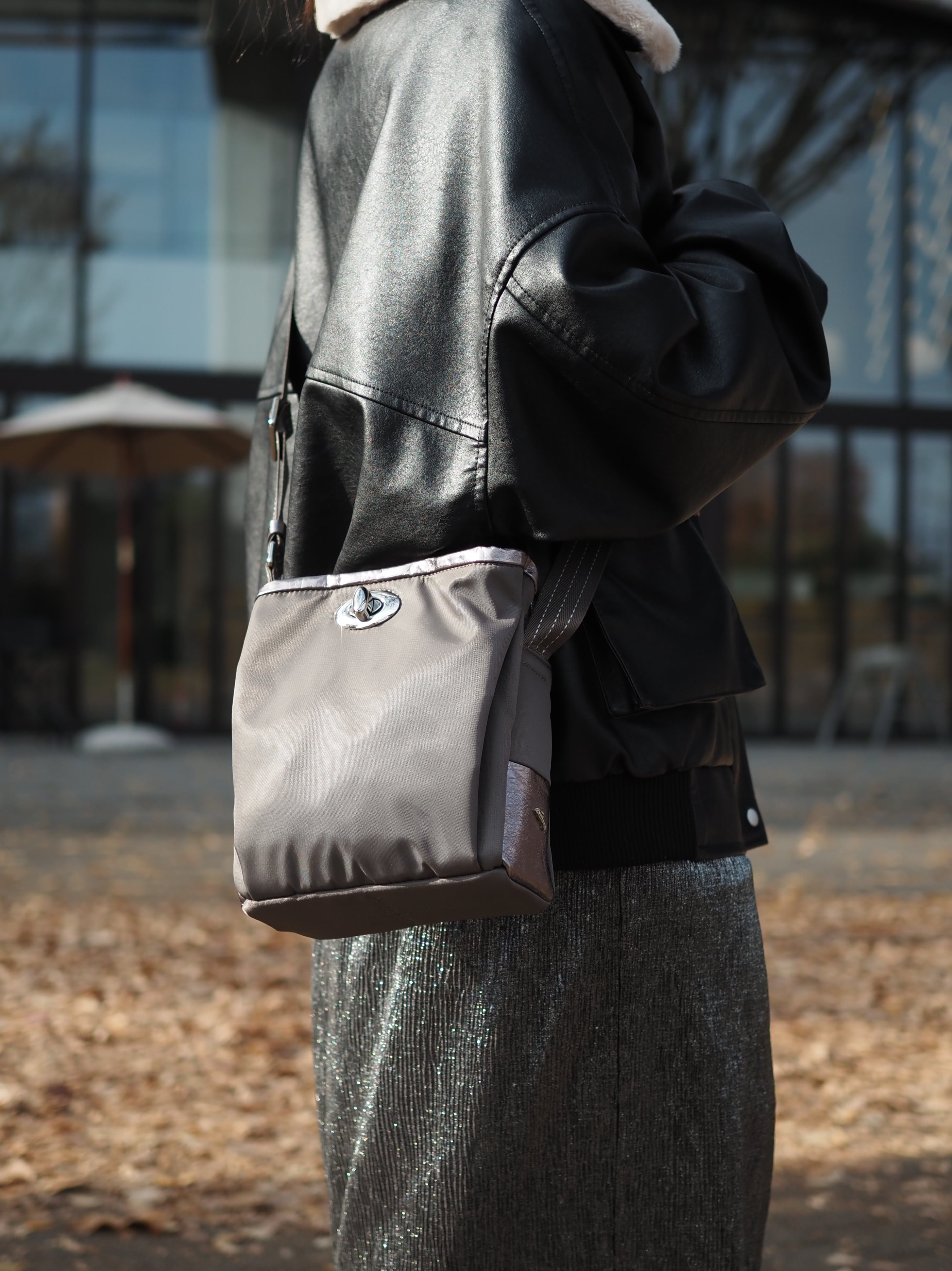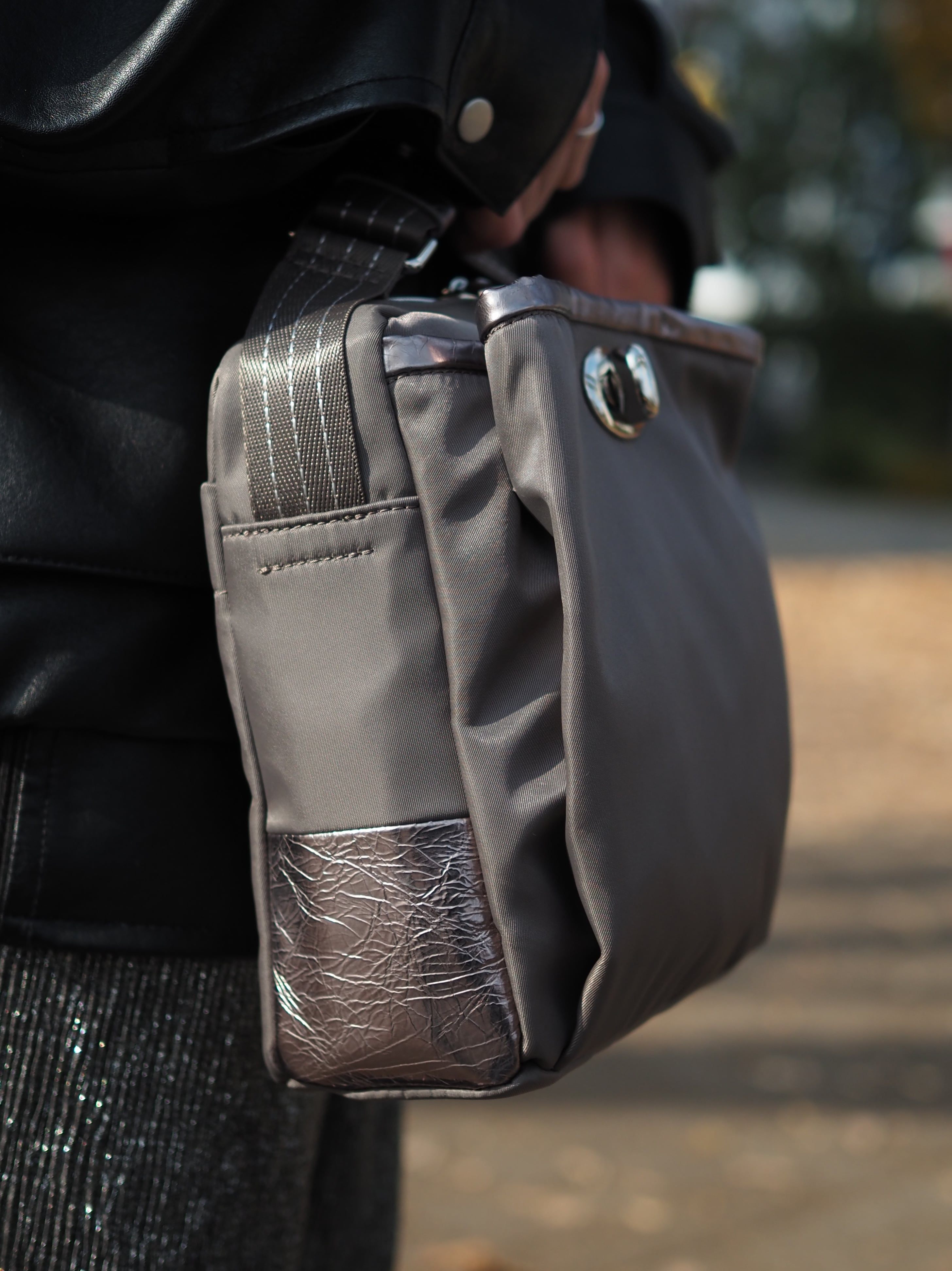 一見シンプルなナイロンショルダーですが、ポイント使いしたメタリックレザーとフロントポケットのひねり金具が共鳴するようなデザインになっています。