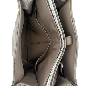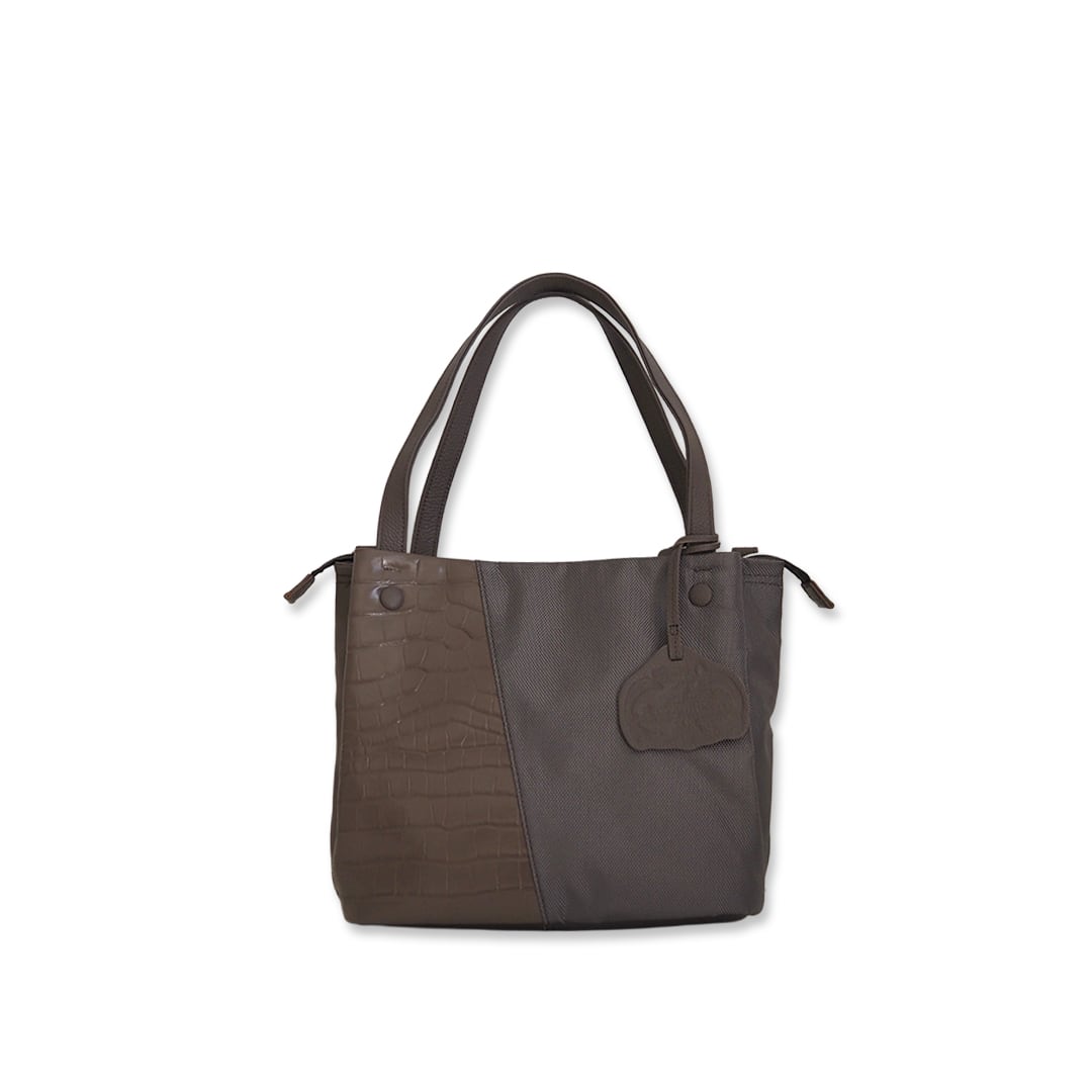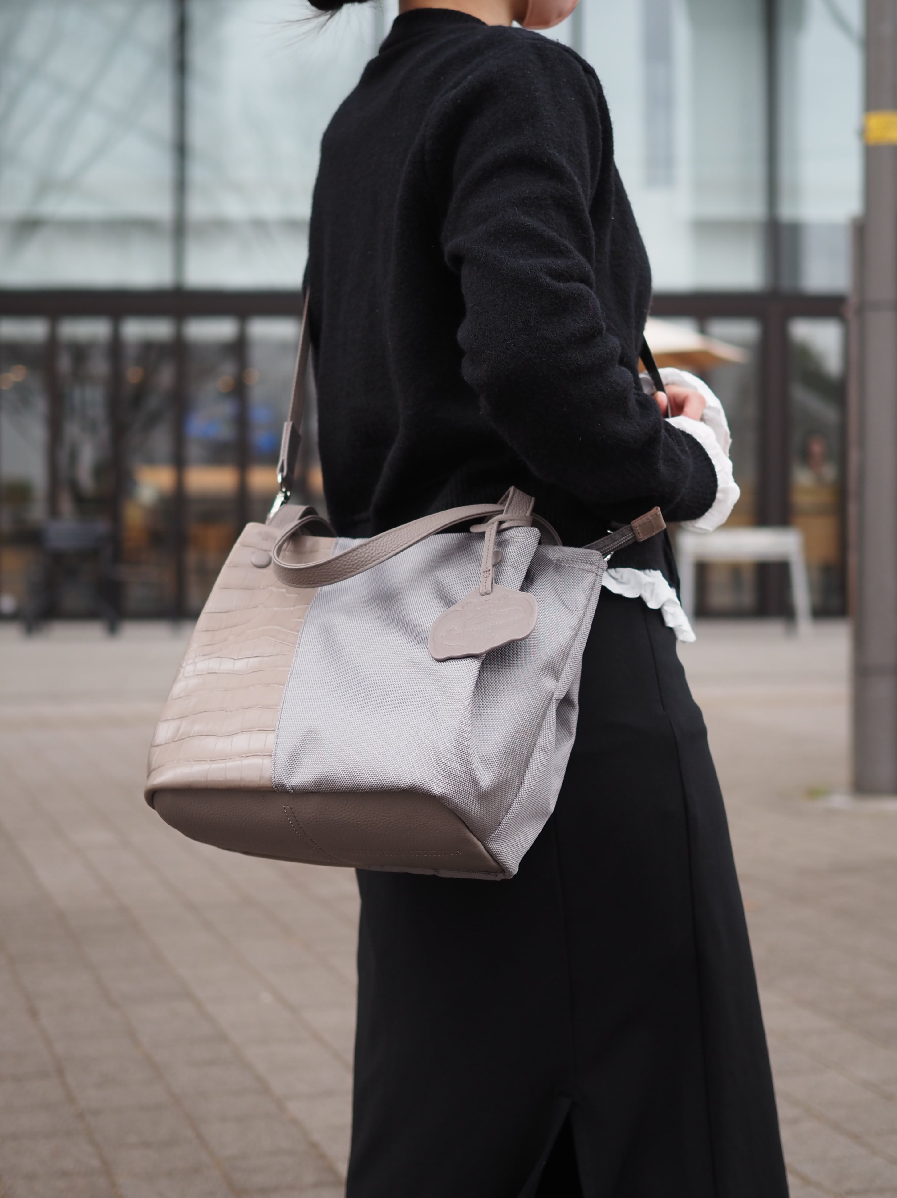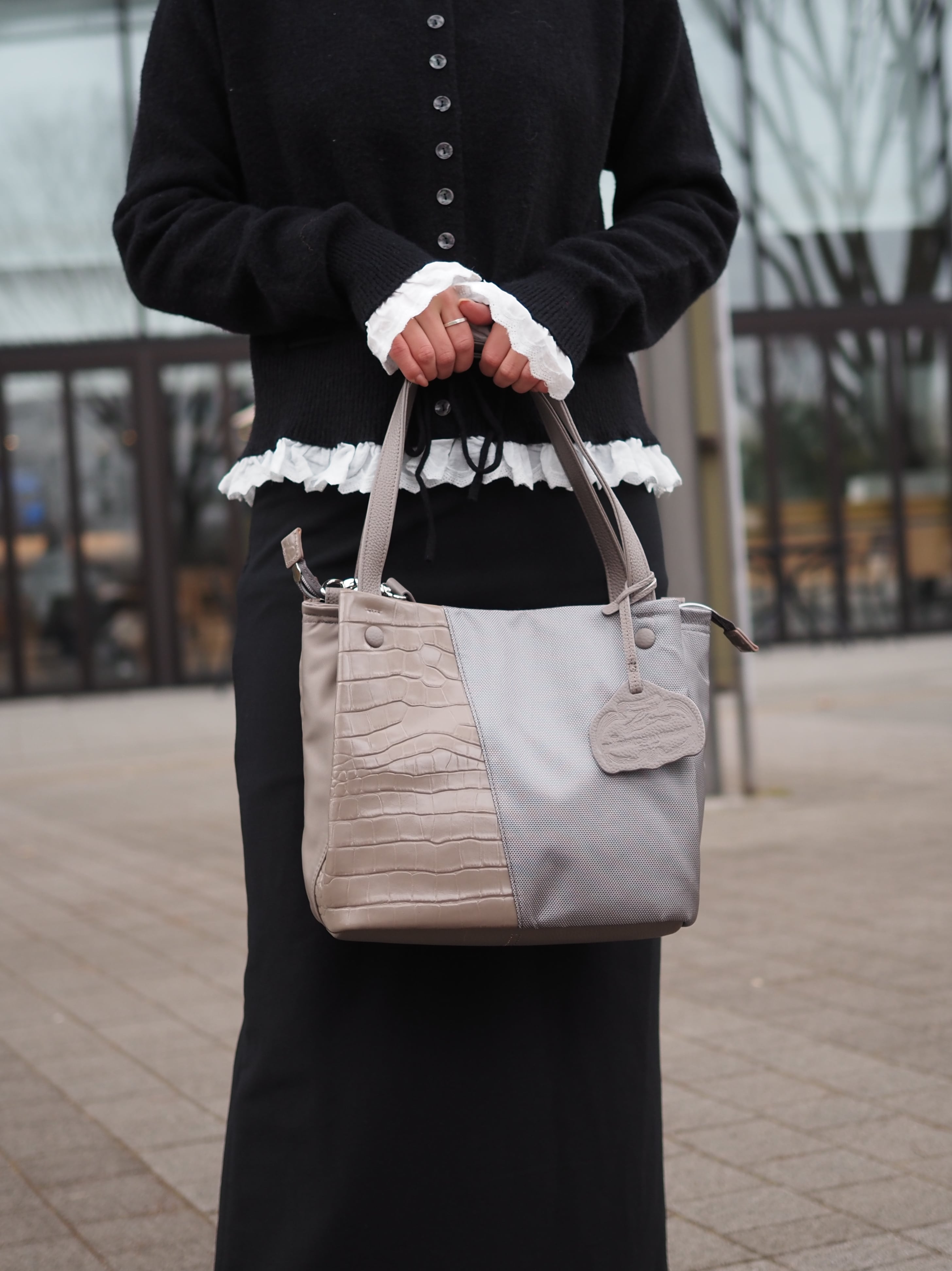 クロコ型押しレザー&ナイロン素材(ともにグレージュ)とポリエステル素材(ライトカーキ)を使用した2wayトートバッグ。