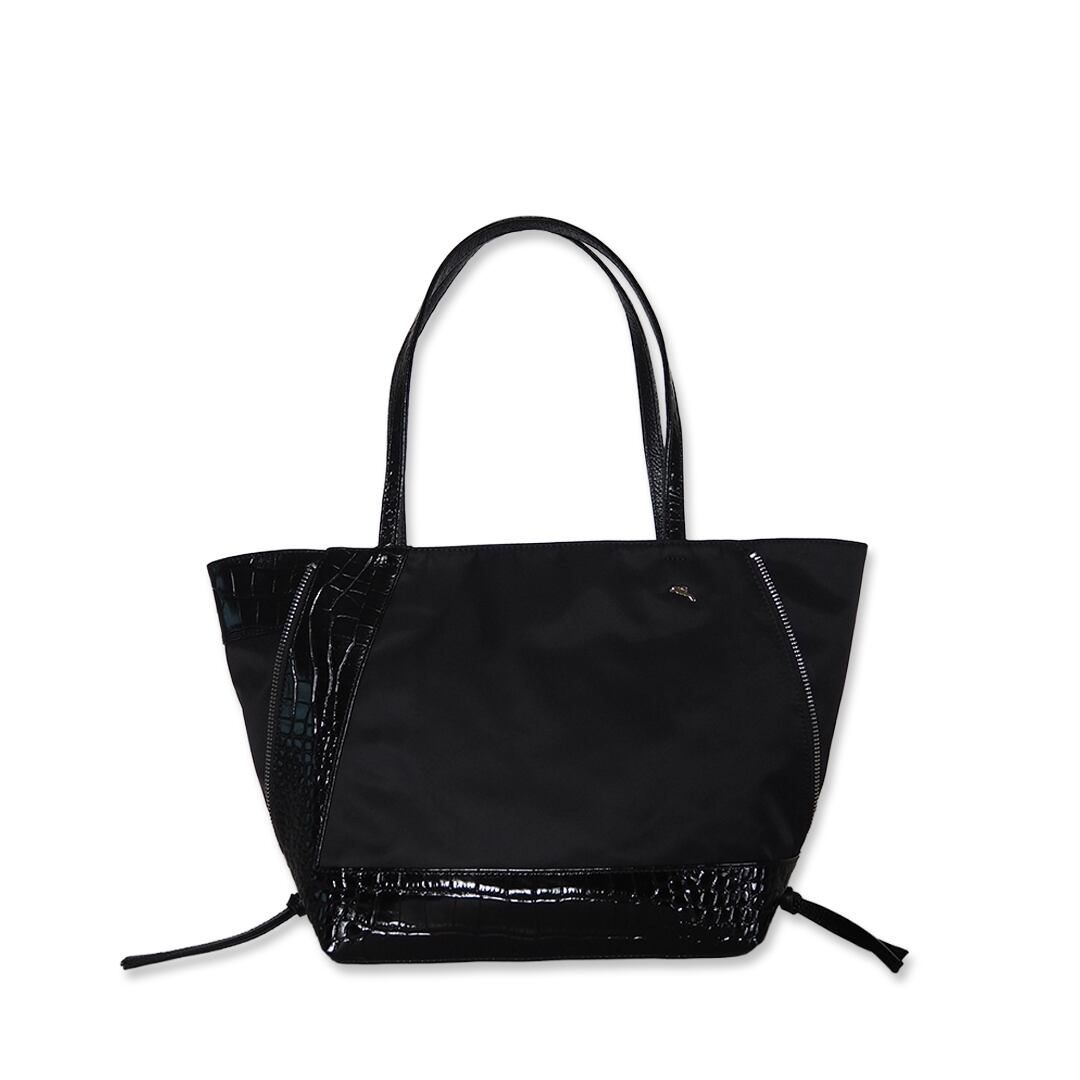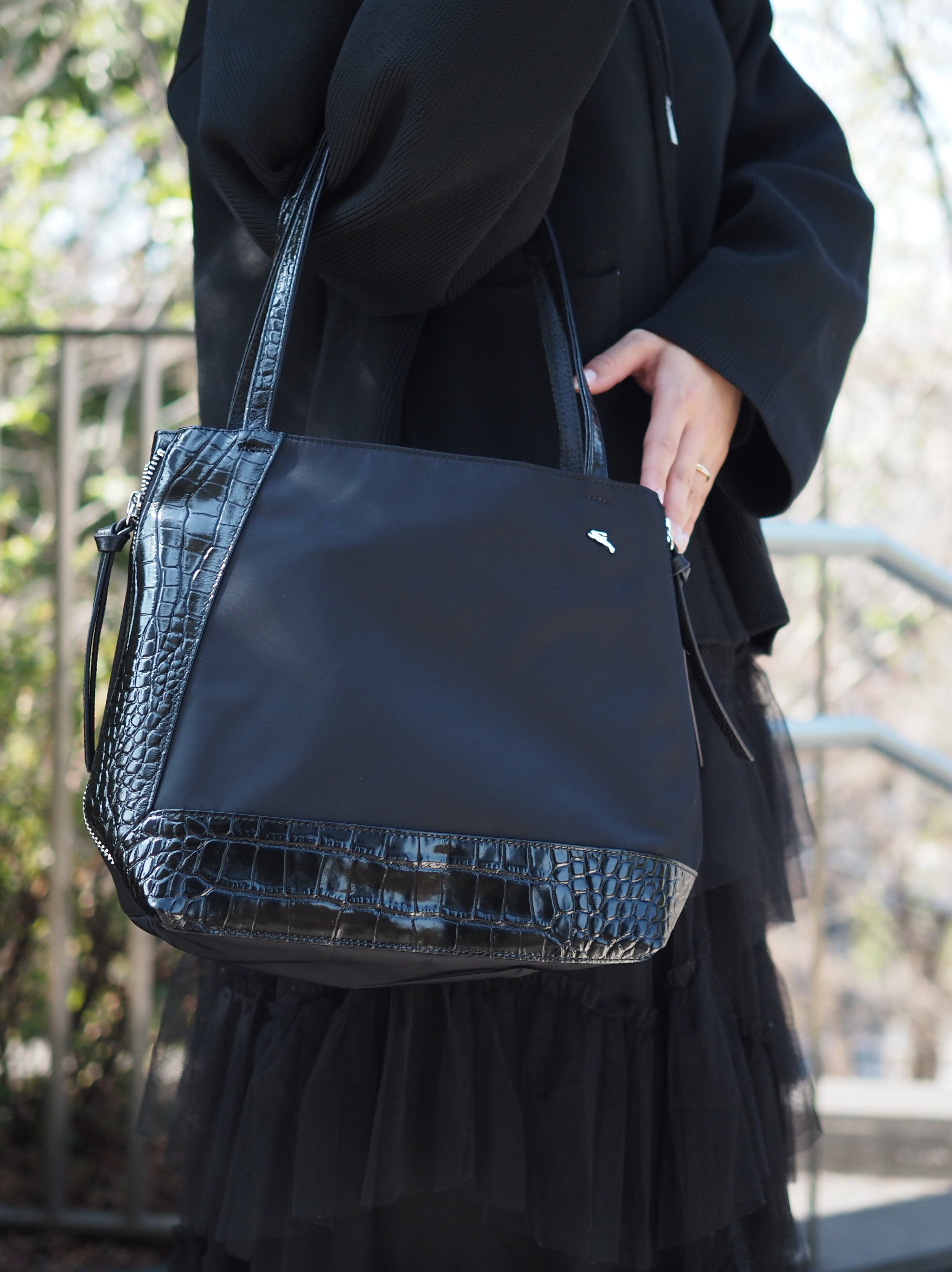 軽量のナイロン素材(ブラック)の本体に、同系色の型押しレザー(ステア)を、贅沢に〈OSAM〉らしくポイント使いしたトートバッグ(Мサイズ)。