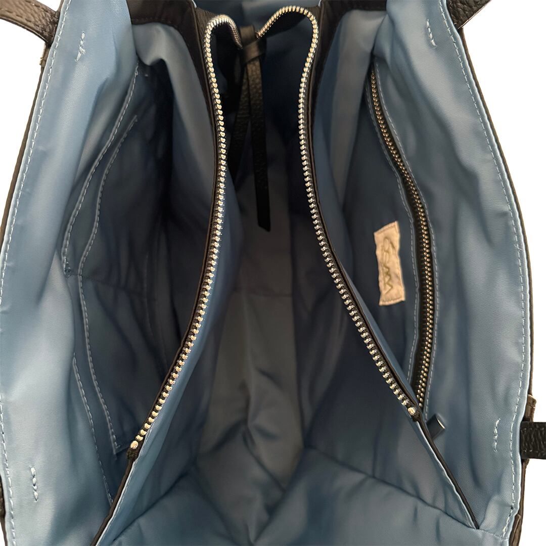 内装カラーのライトブルーにより抜け感もプラスされ、きれいめにもカジュアルにも、スタイリングしやすいブラックカラーのバッグに仕上がりました。
