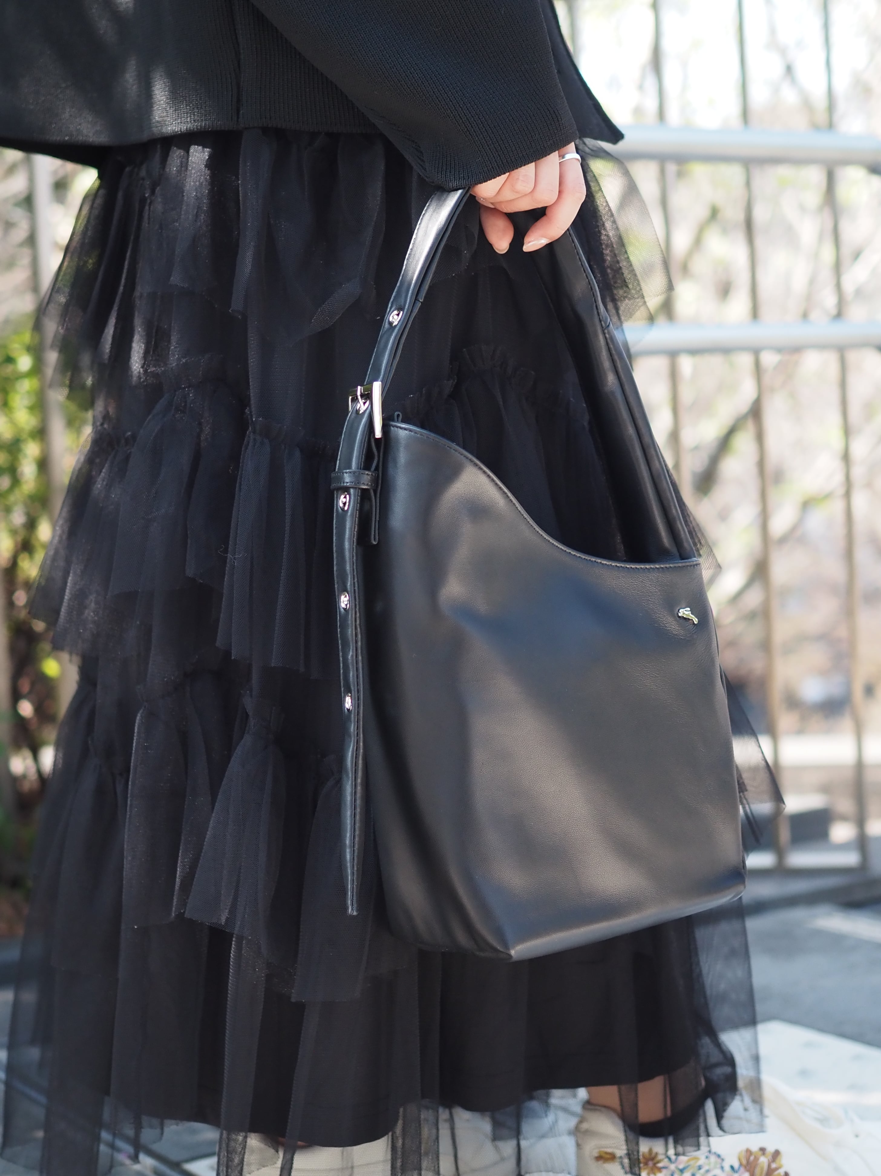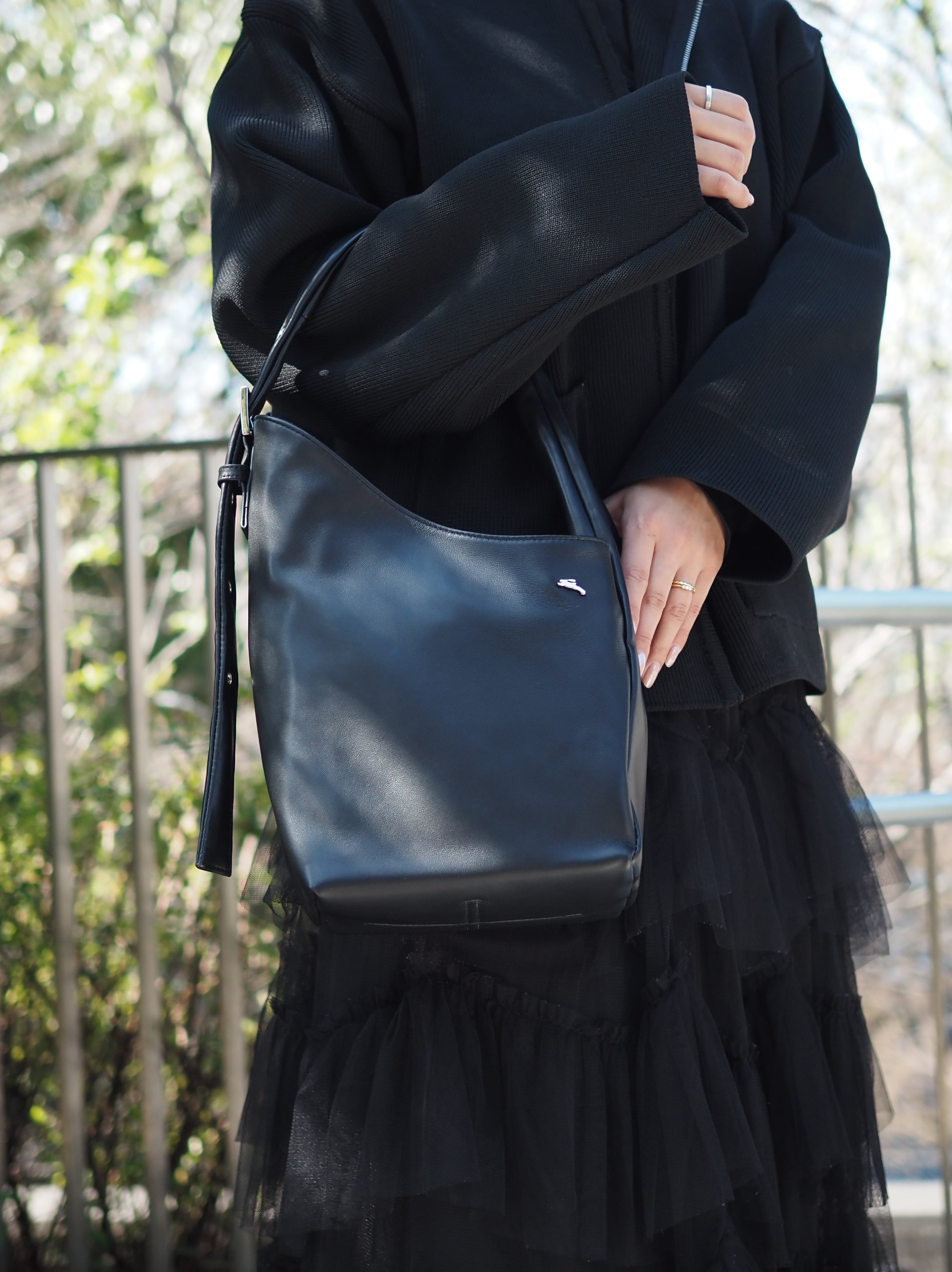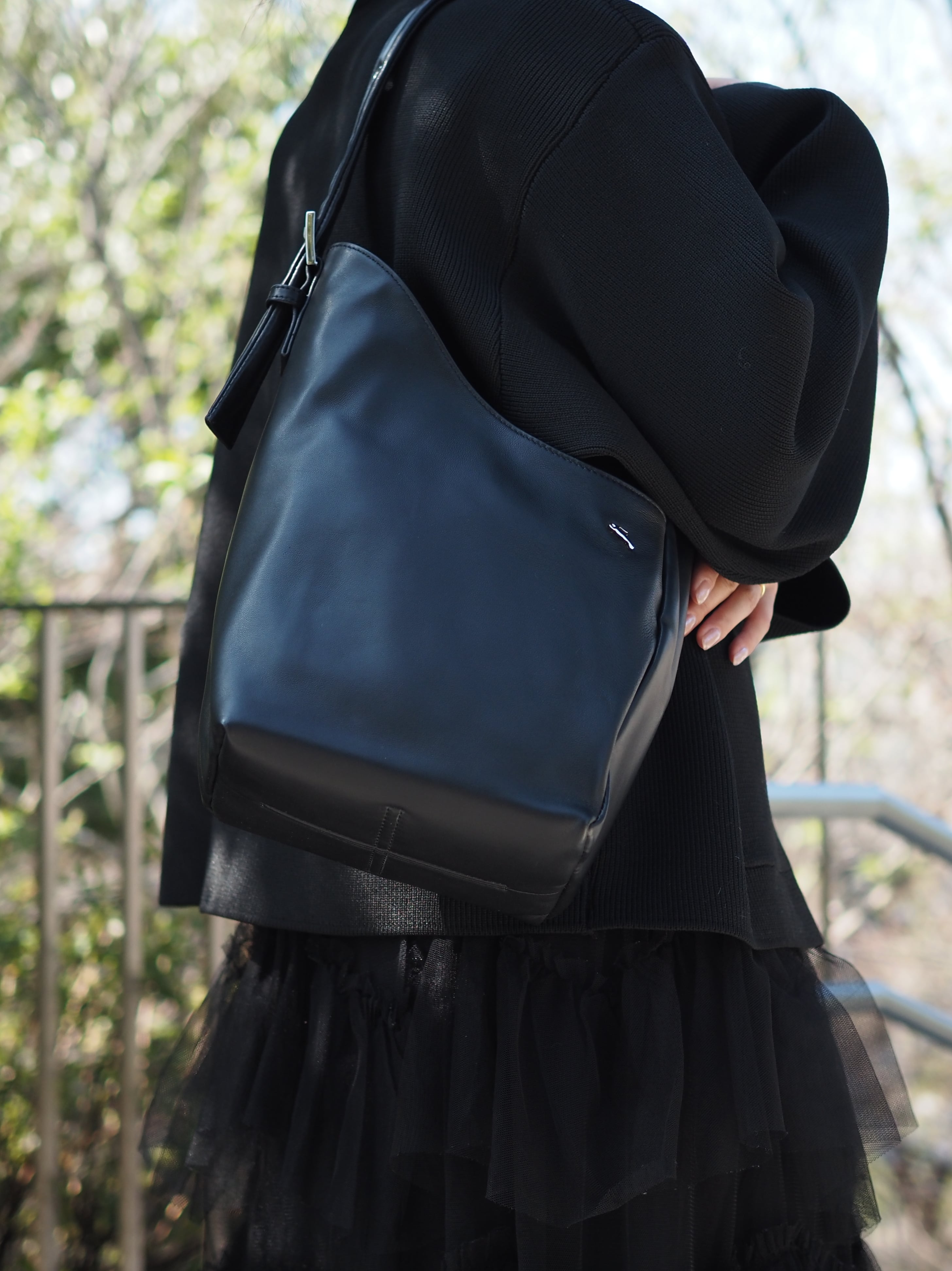 とても軽くなめらかなシープレザー(ブラック)でお仕立てしたワンハンドルのフォルムが美しい小さなセミショルダーバッグ。