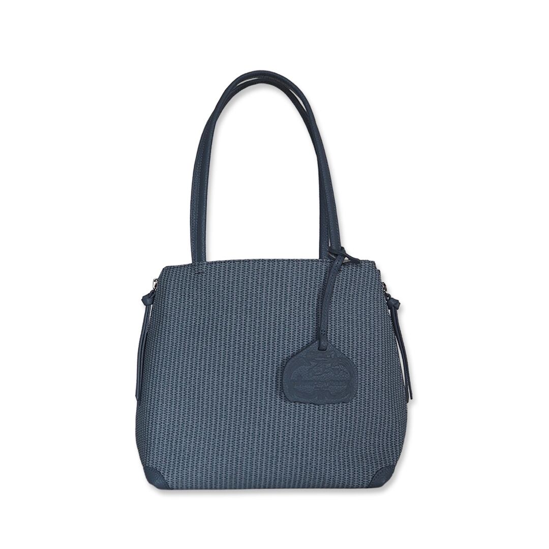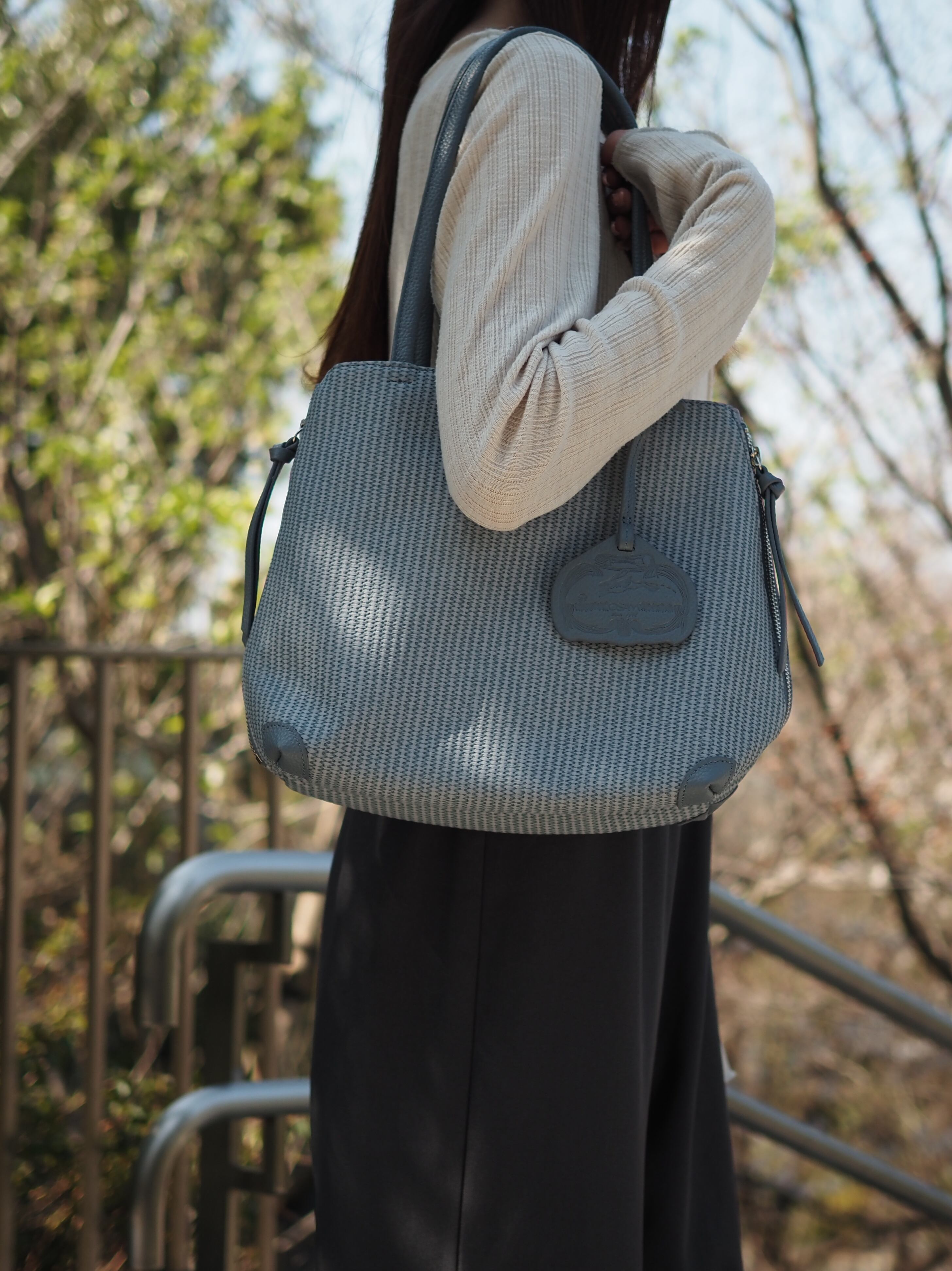 まるで〈カゴバッグ〉のような型押しを施した合成皮革(ライトブルー系)の本体と、同系色のレザーハンドル(ステア)でお仕立てしたトートバッグ(Мサイズ)。