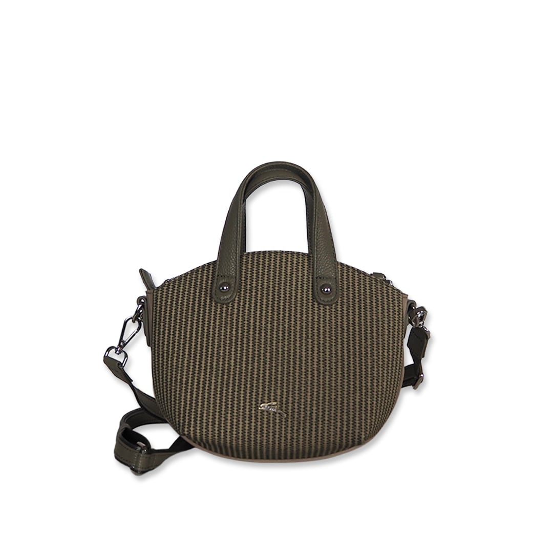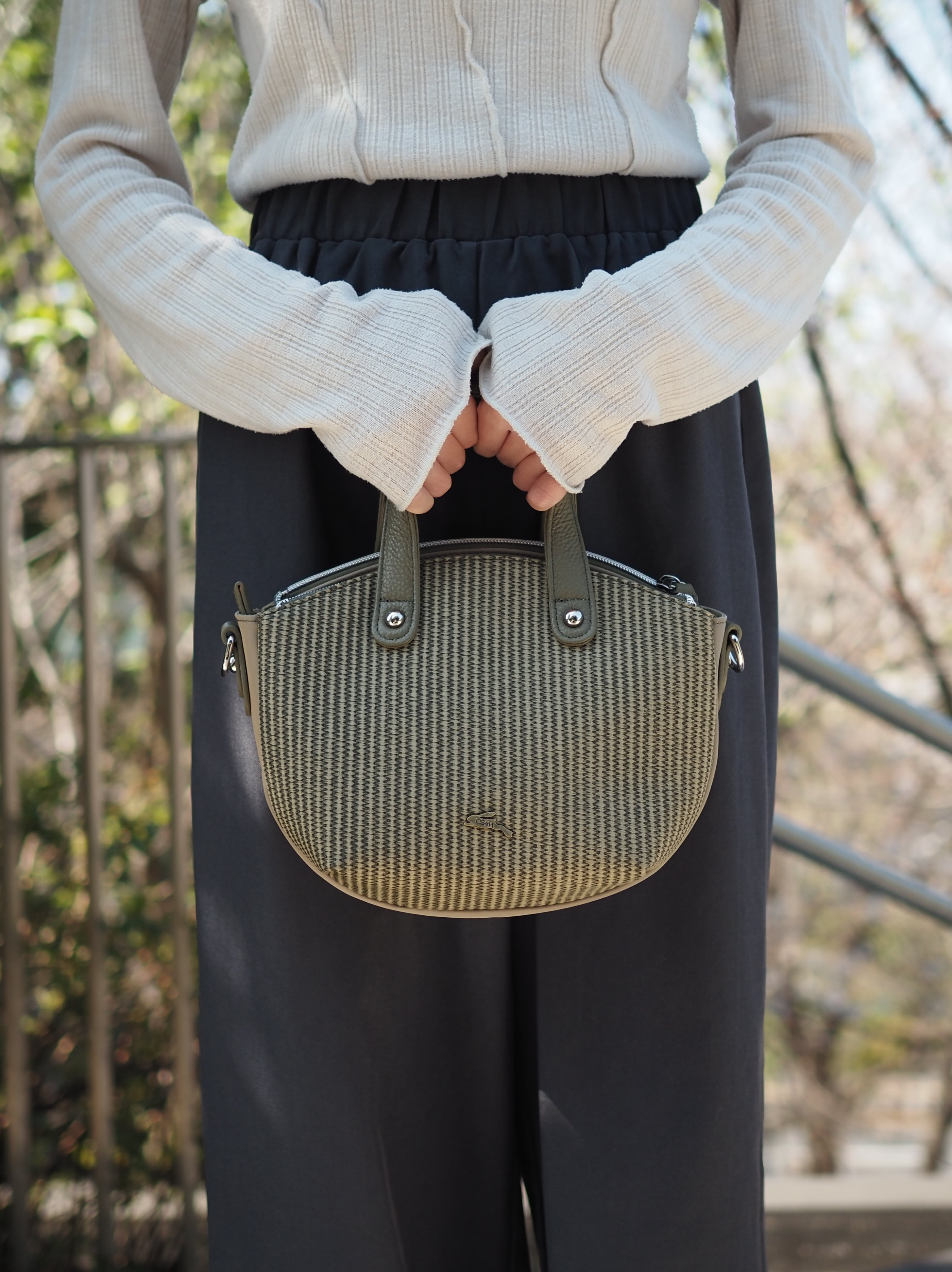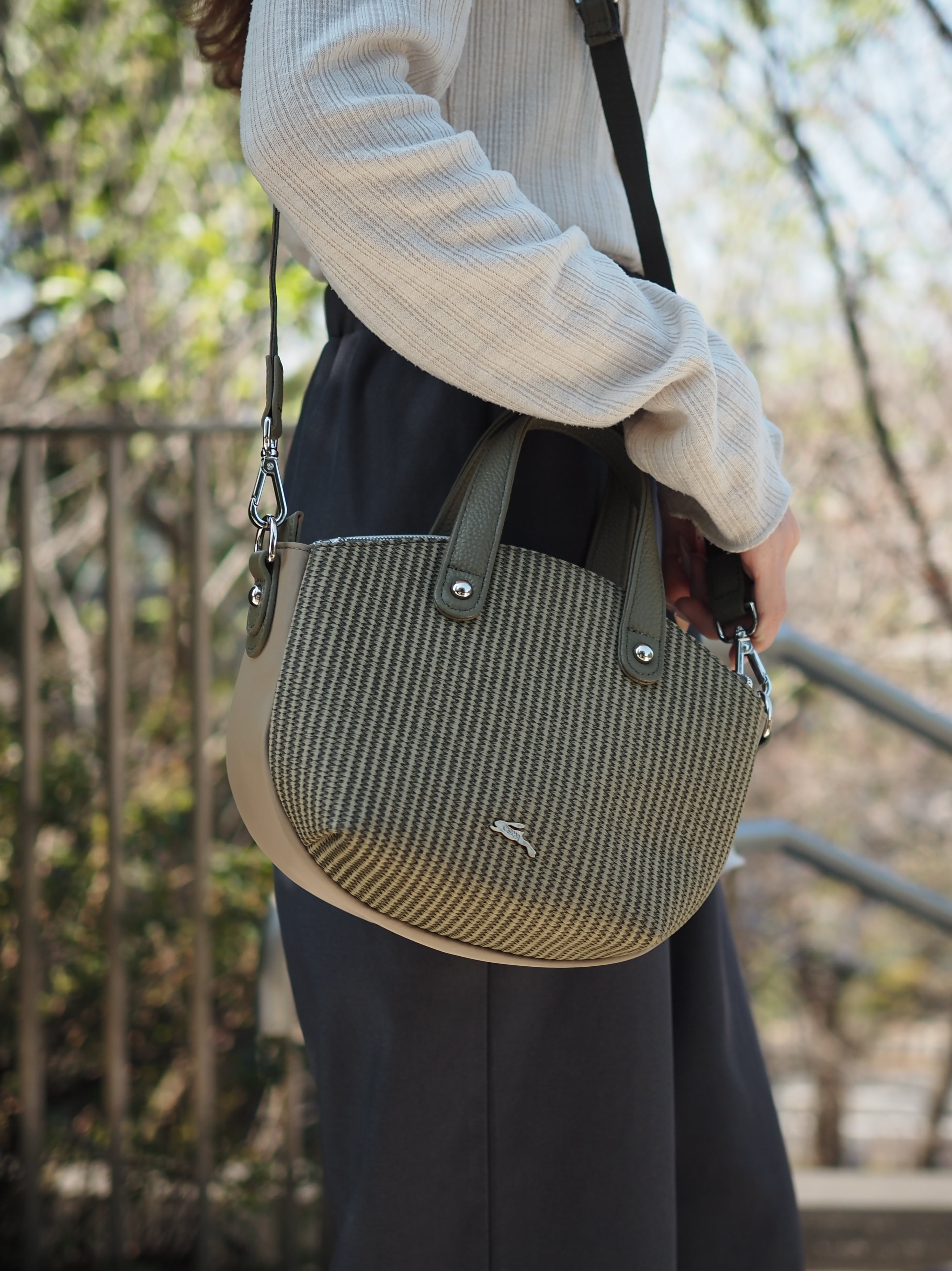 まるで〈カゴバッグ〉のような型押しを施した合成皮革(ライトカーキ)と同系色のレザー(ステア)、ナイロンでお仕立てした小さめサイズの2wayハンドバッグ。