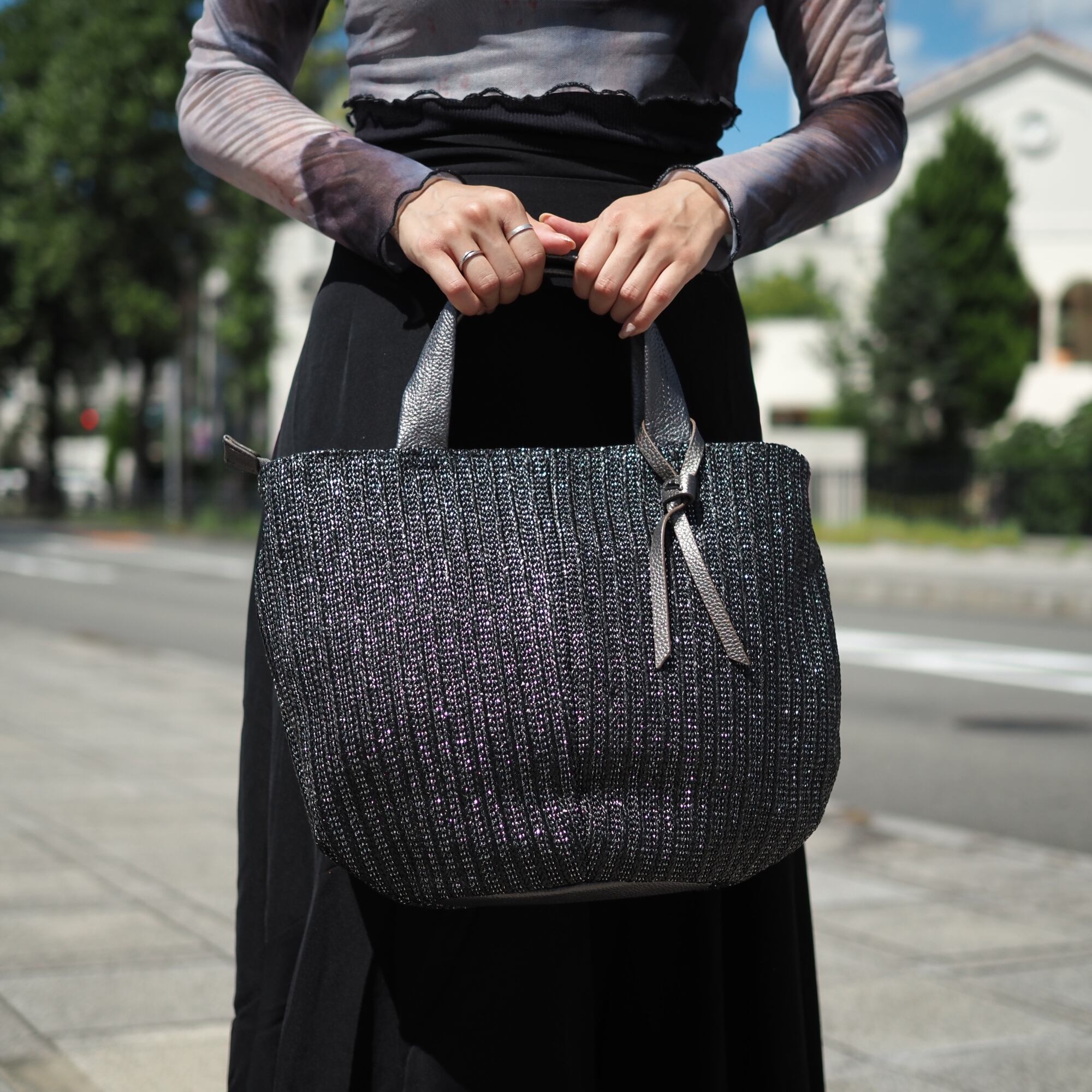 本体は人工ラフィア、ハンドルやチャームは牛革を使用
