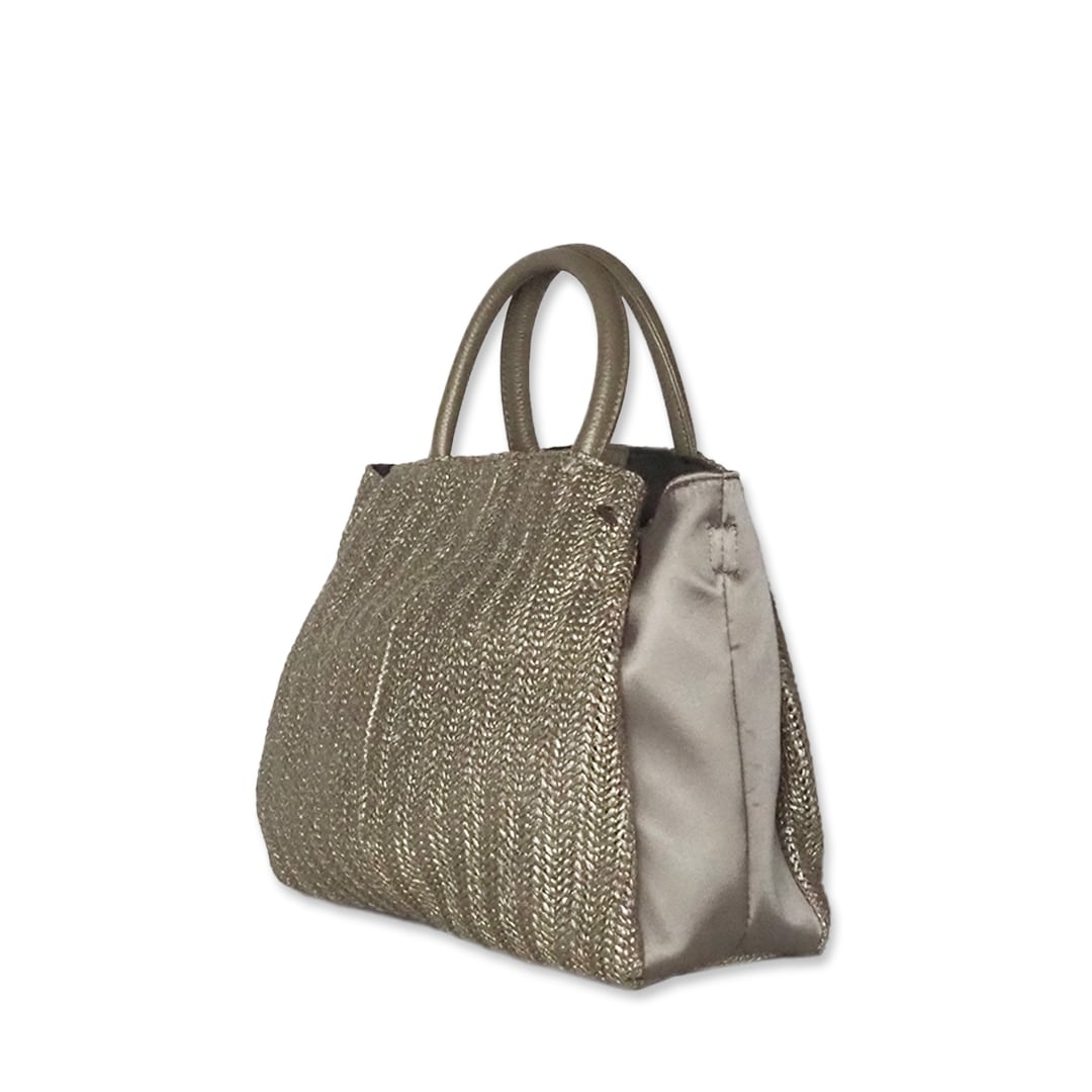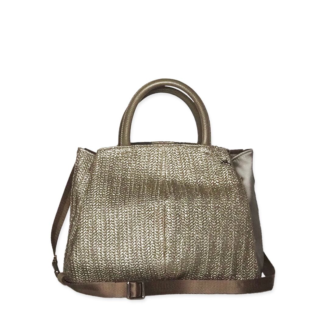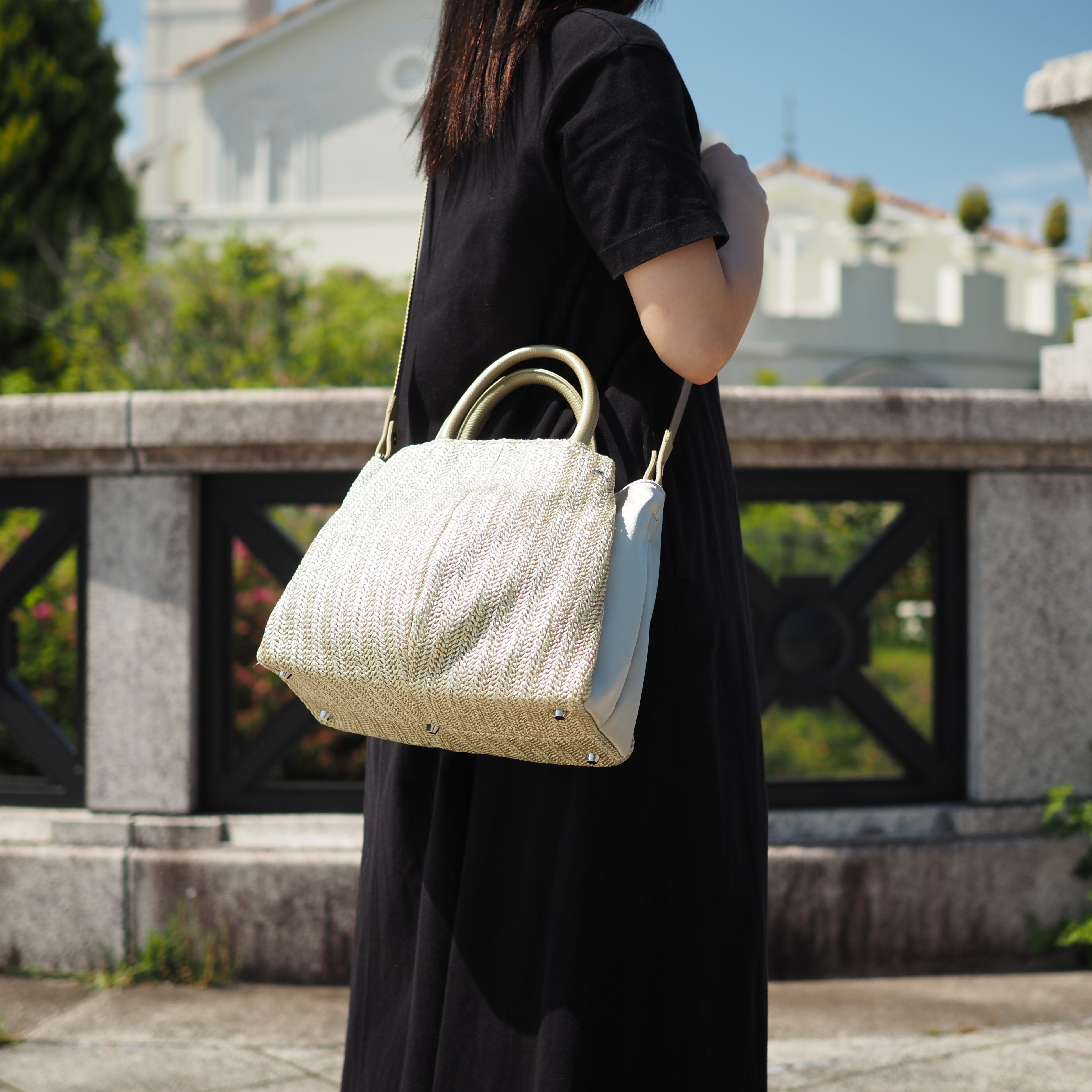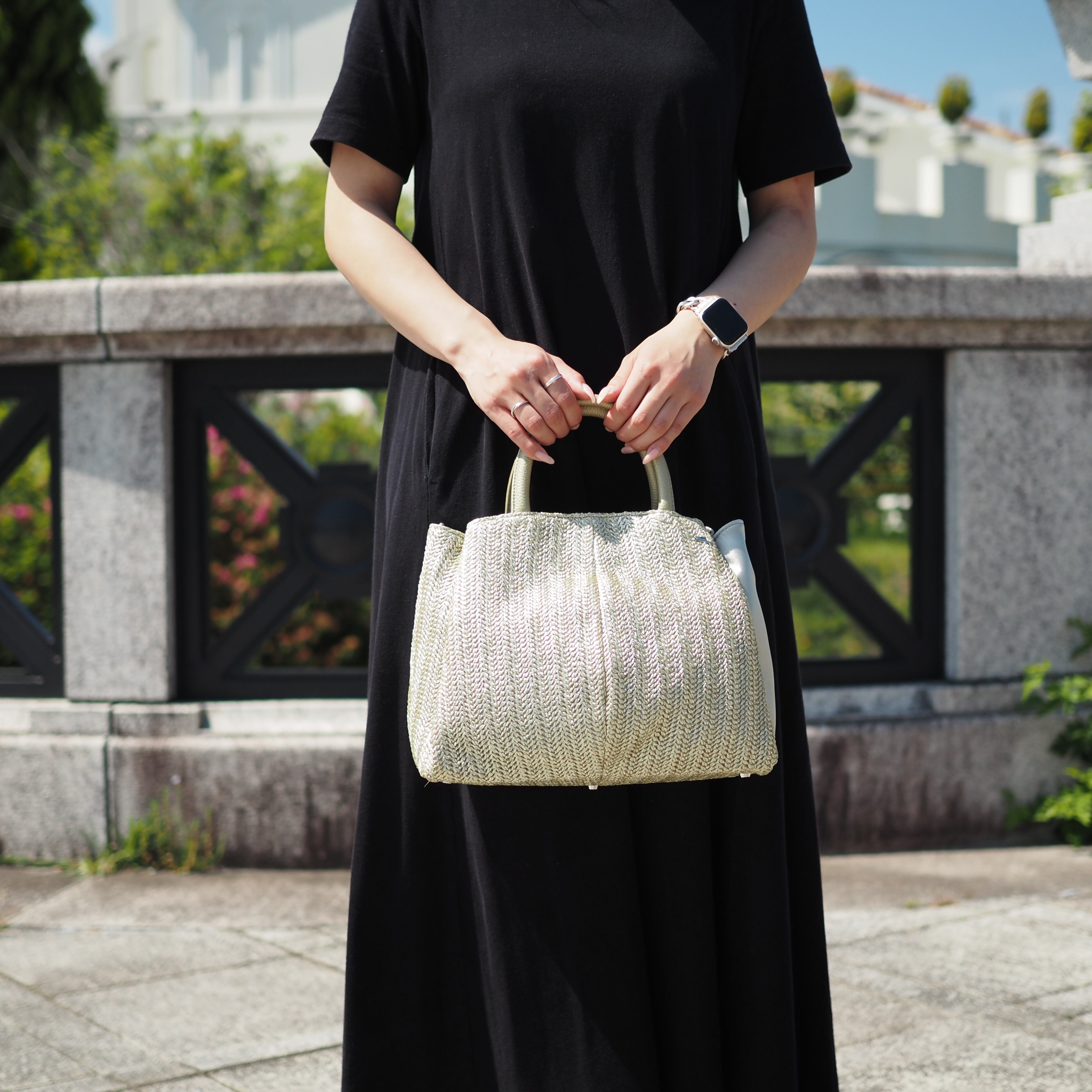 軽量で爽やかな人工ラフィア素材を使用し、ゴールド寄りのメタリックカーキのカラーがスタイリングもしやすい2wayハンドバッグ。