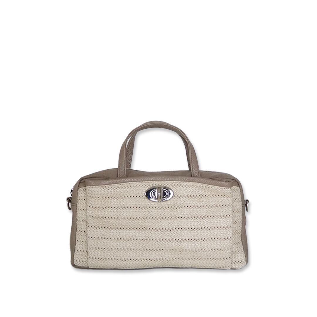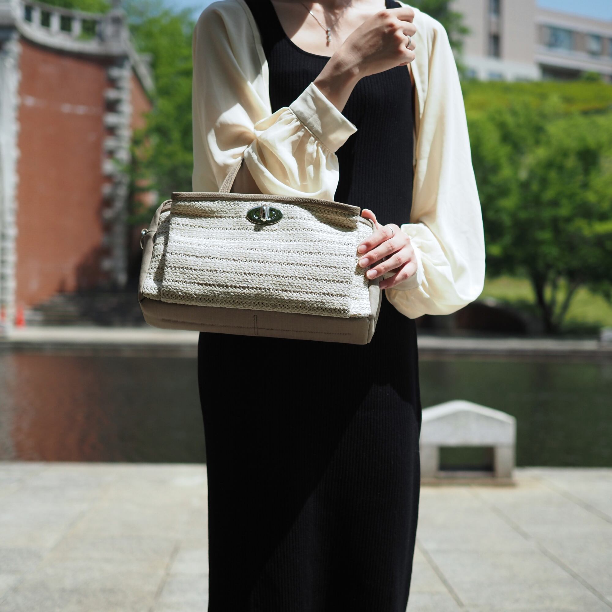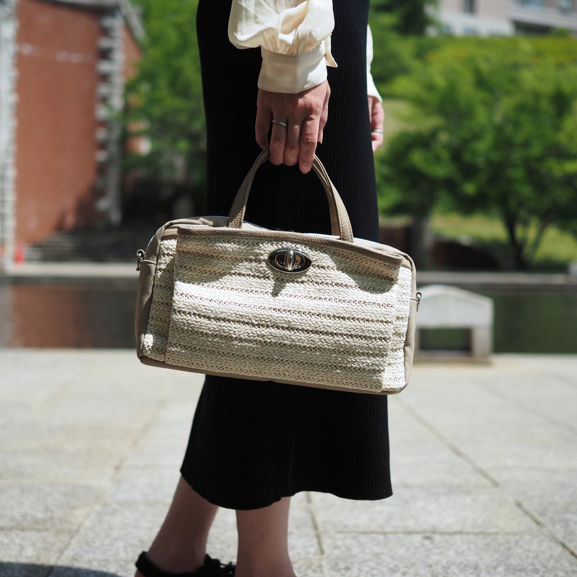 軽量の人工ラフィア素材(アイボリー)とベージュカラーのレザーとポリエステル素材で構成された、シンプルかつクラシカルなデザインの2wayハンドバッグ。