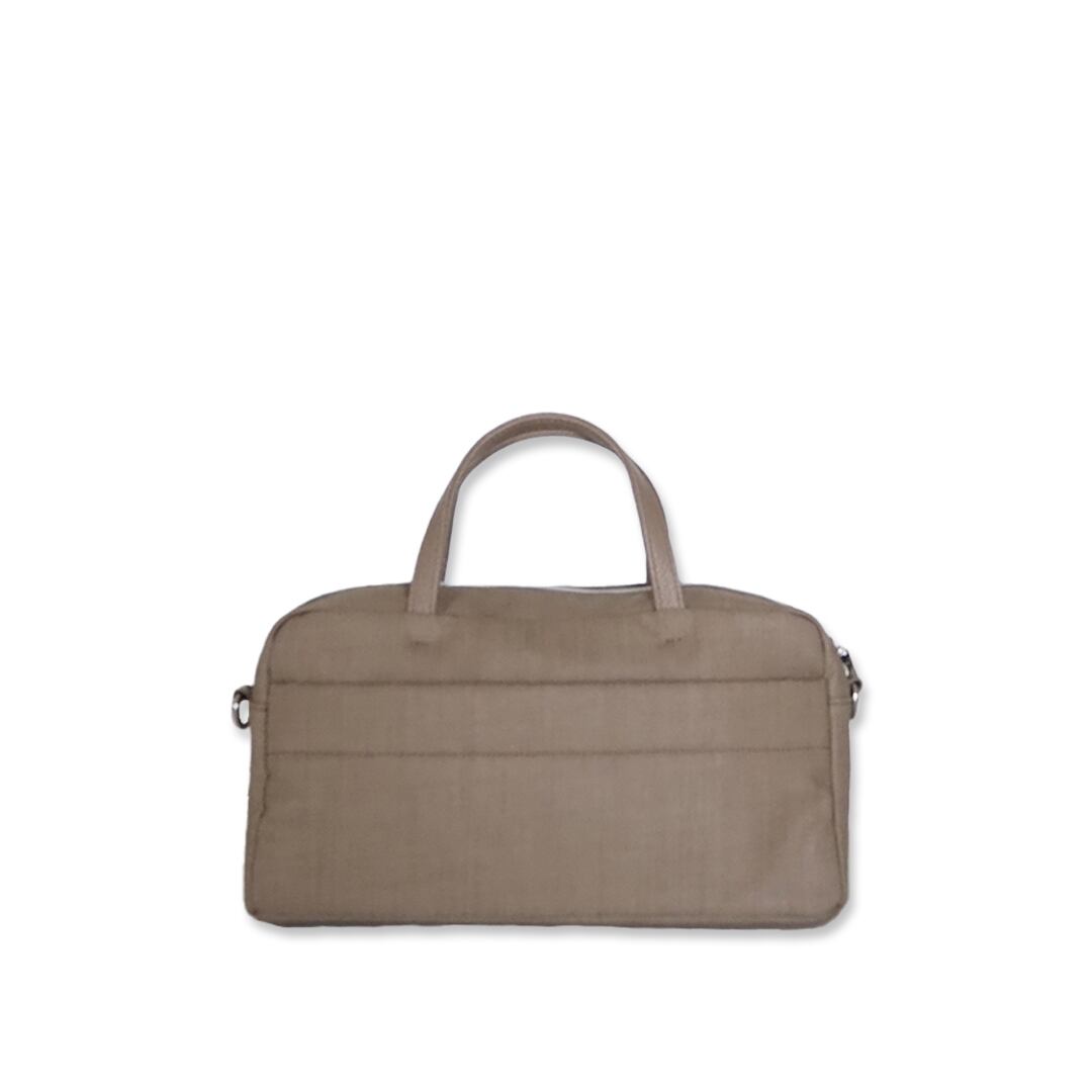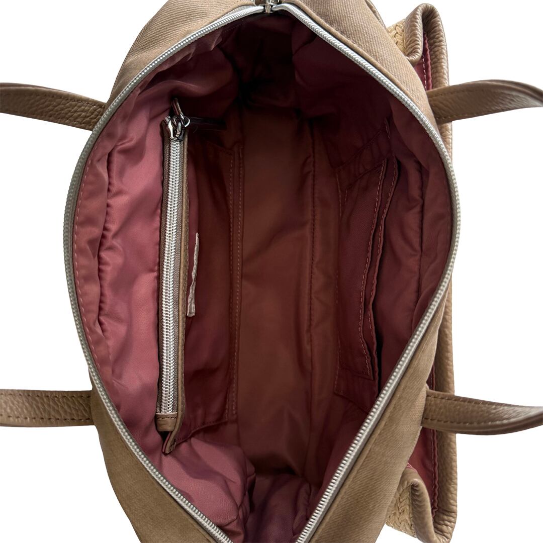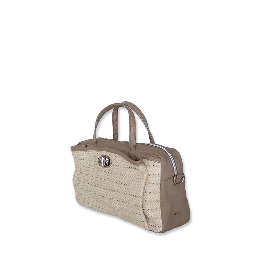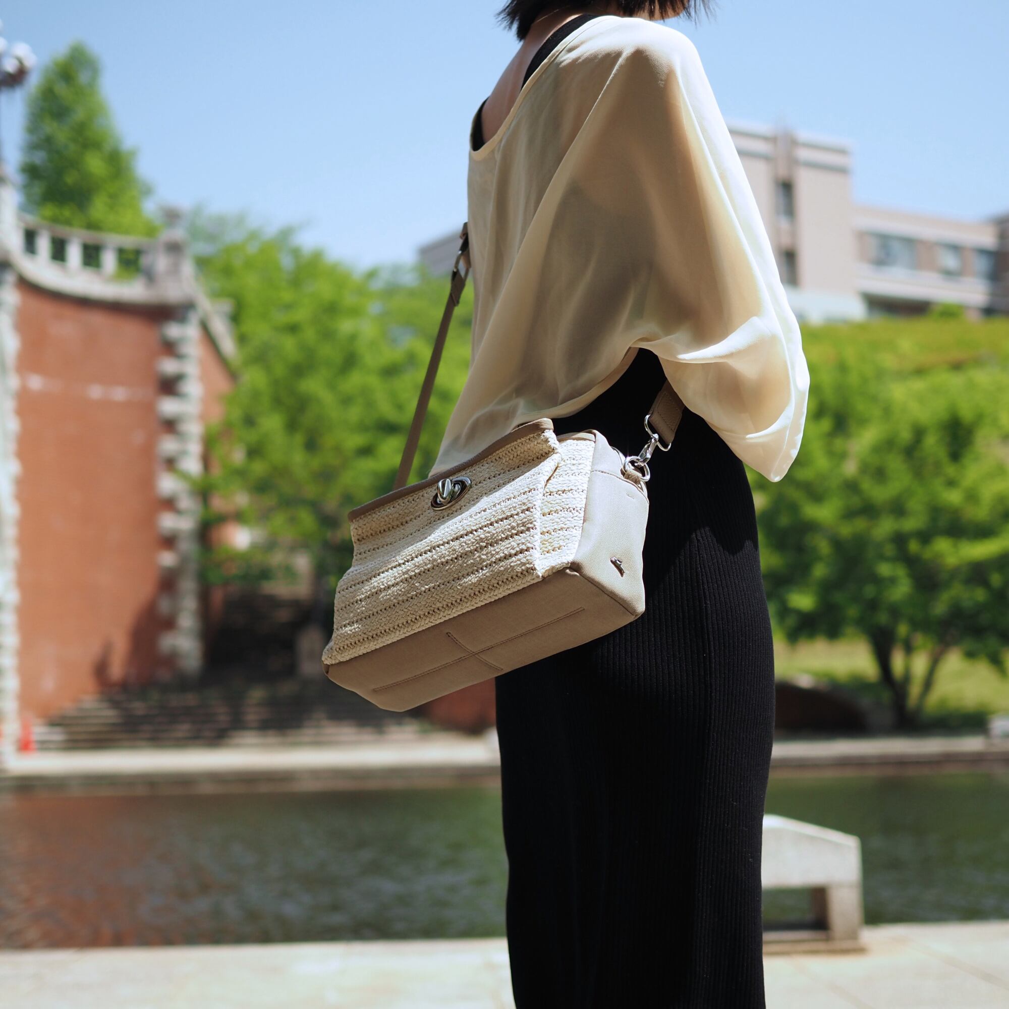 軽量の人工ラフィア素材(アイボリー)とベージュカラーのレザーとポリエステル素材で構成された、シンプルかつクラシカルなデザインの2wayハンドバッグ。