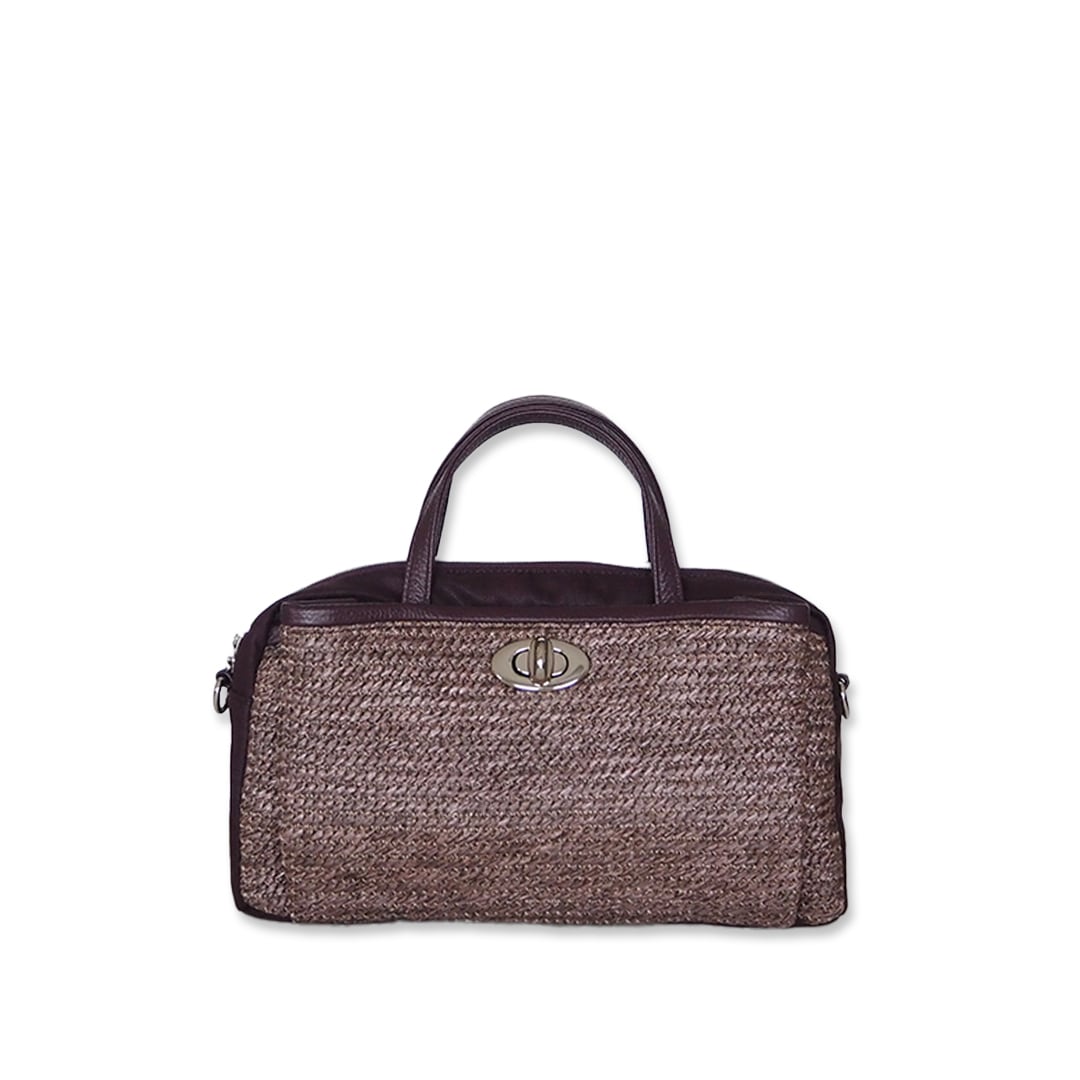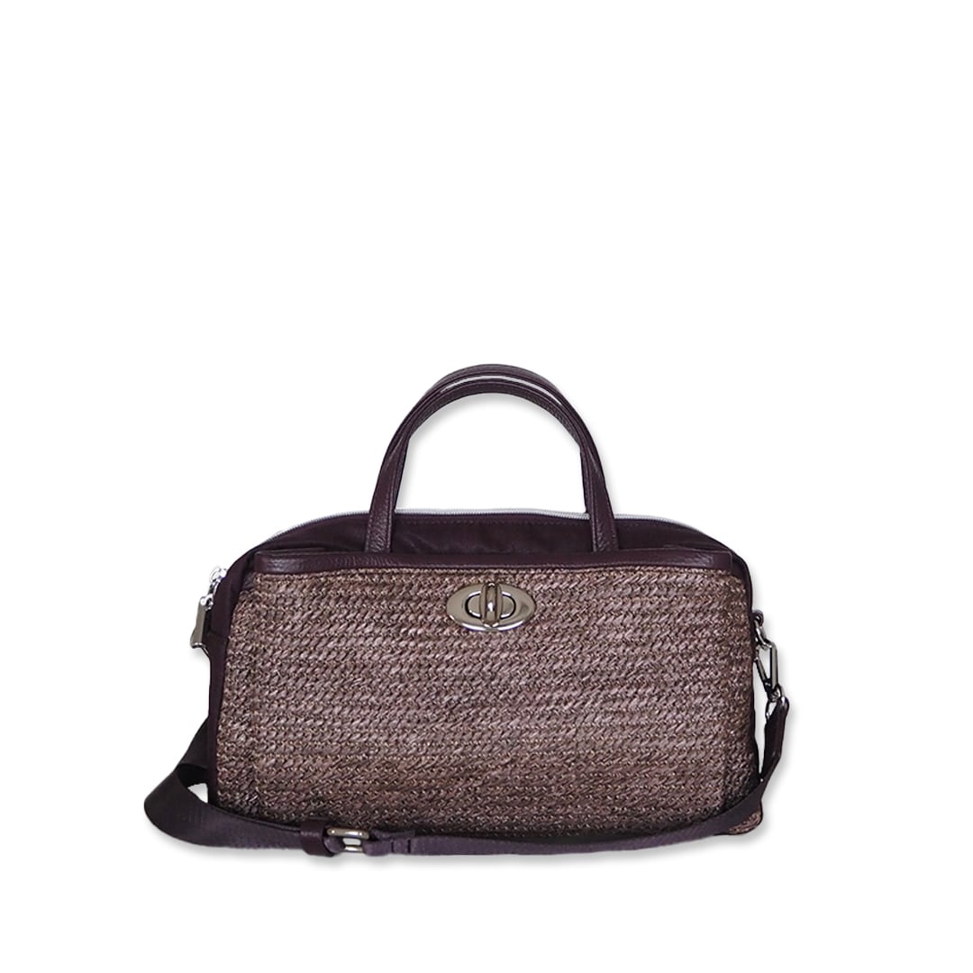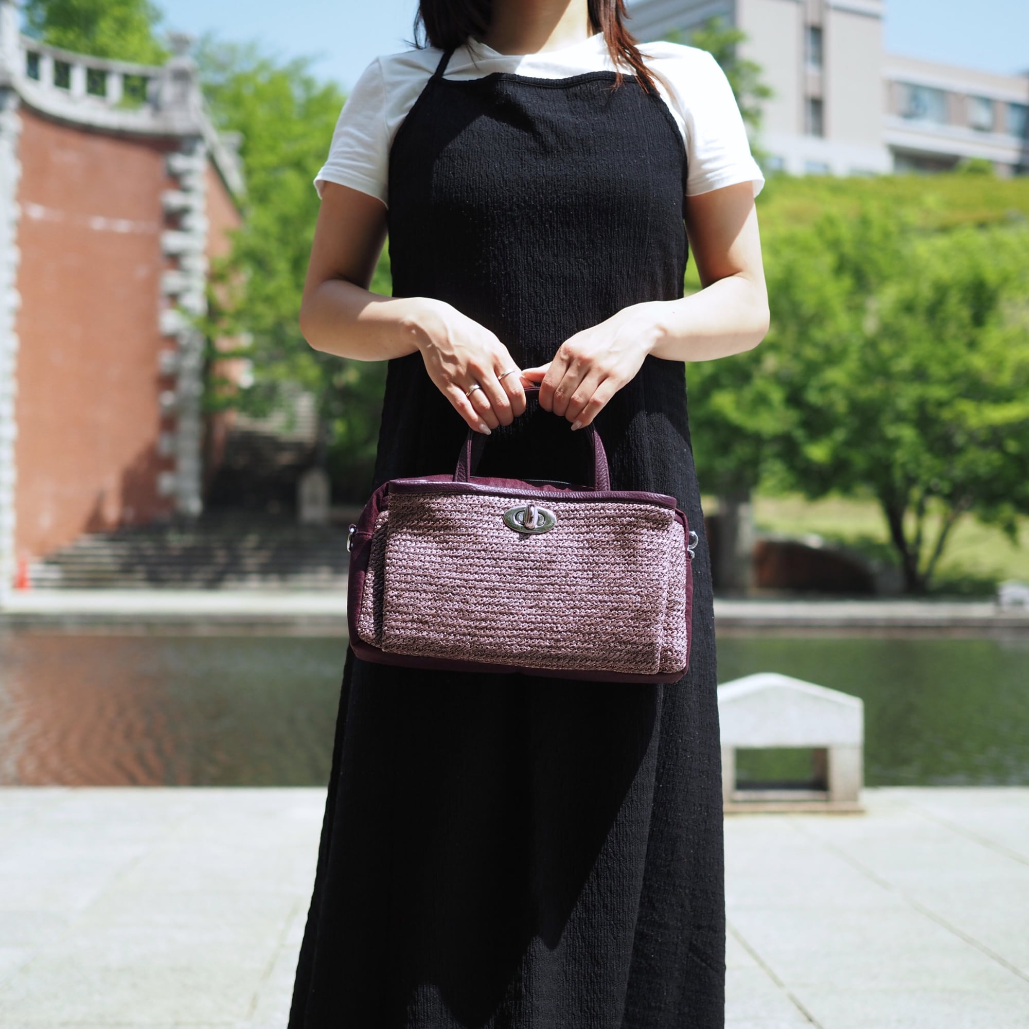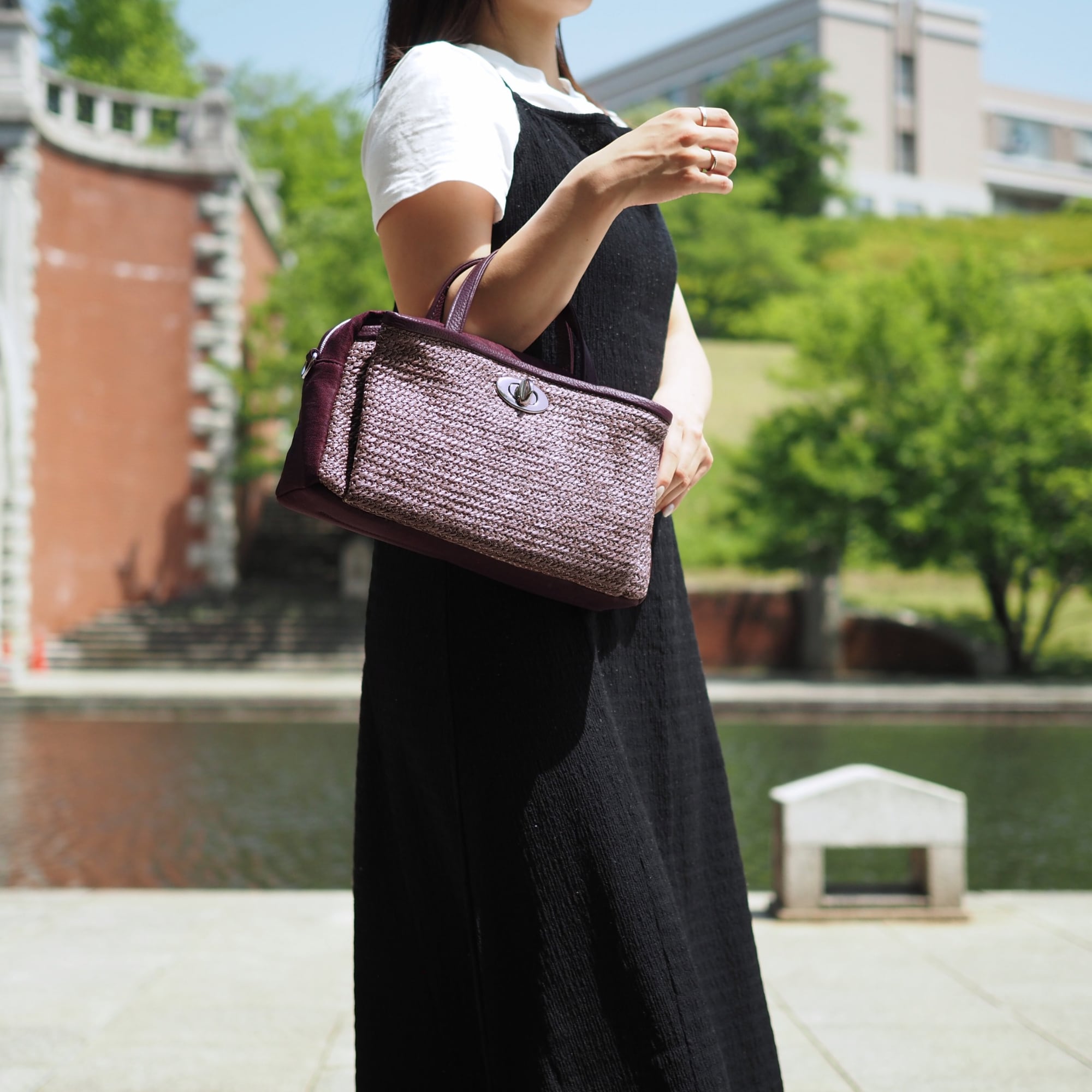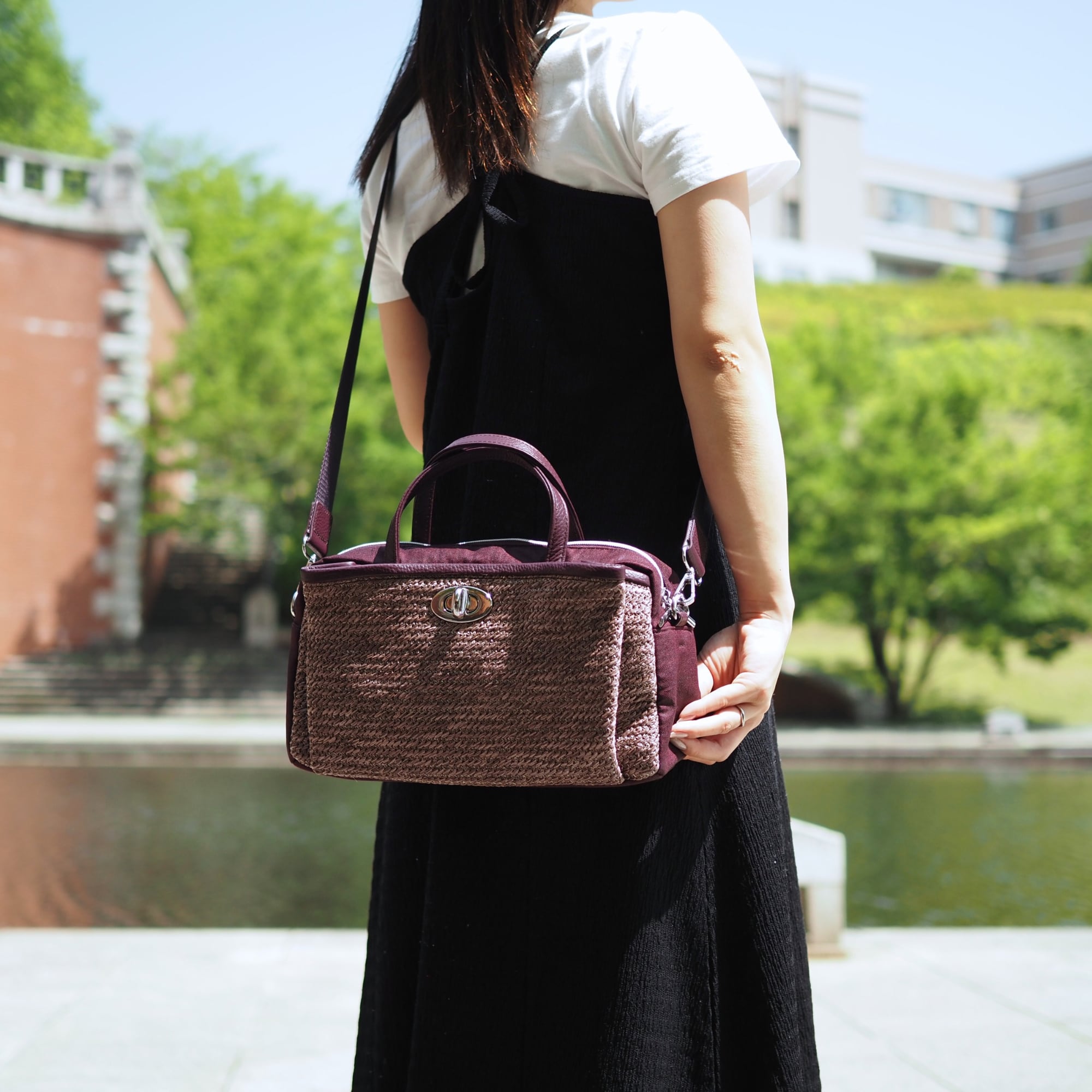 軽量の人工ラフィア素材(バーガンディ)とワインカラーのレザーとポリエステル素材で構成された、シンプルかつクラシカルなデザインの2wayハンドバッグ。