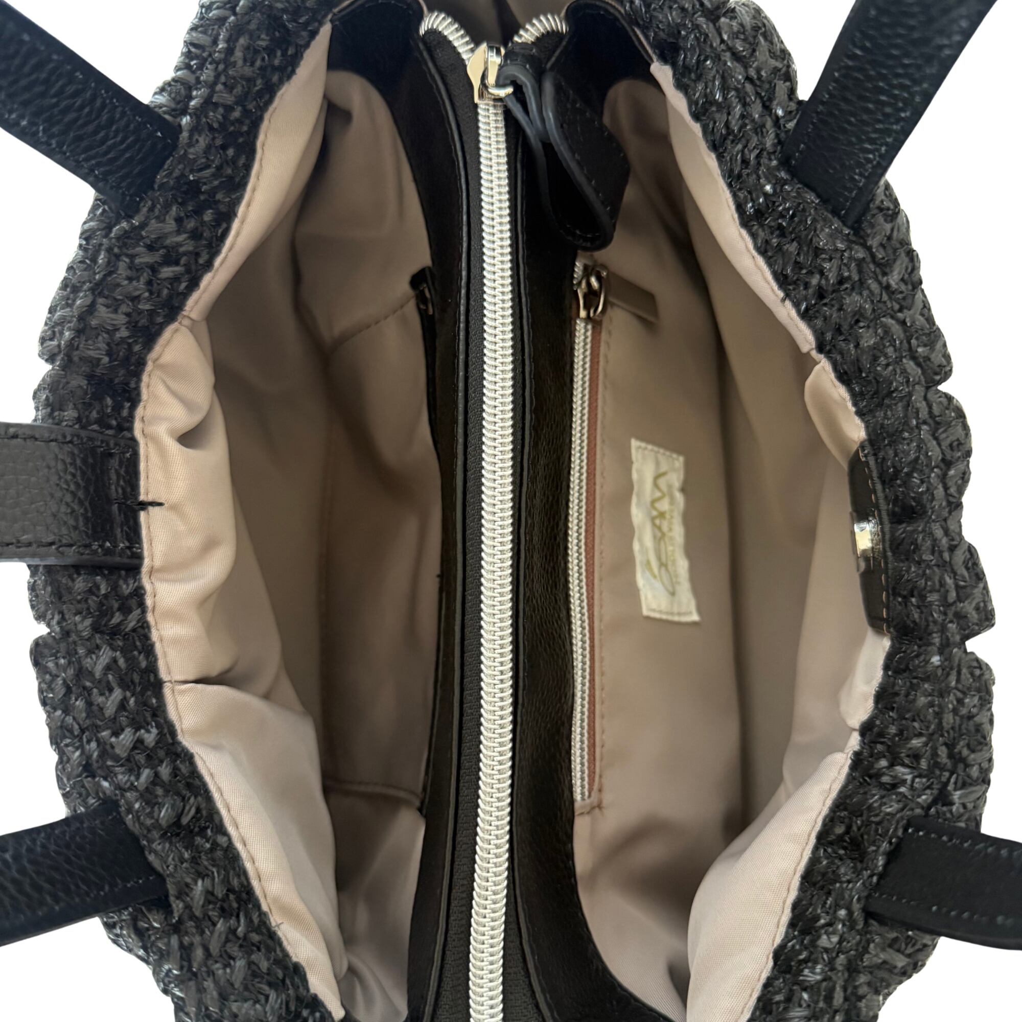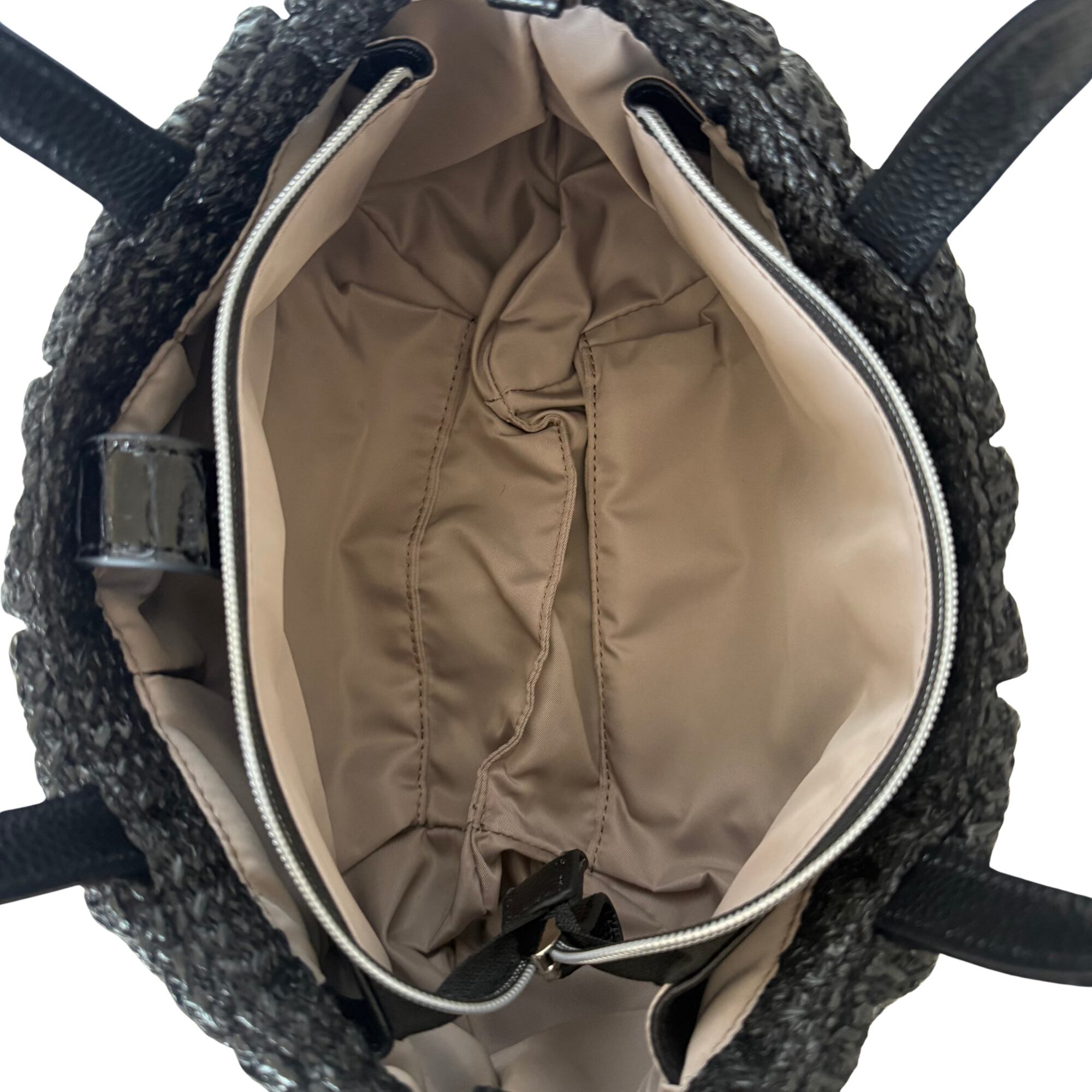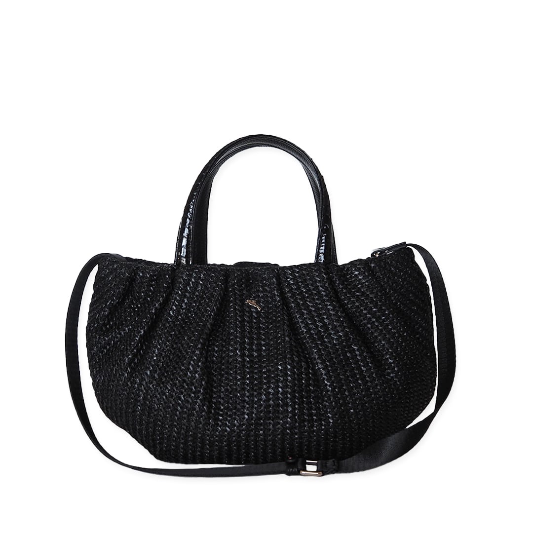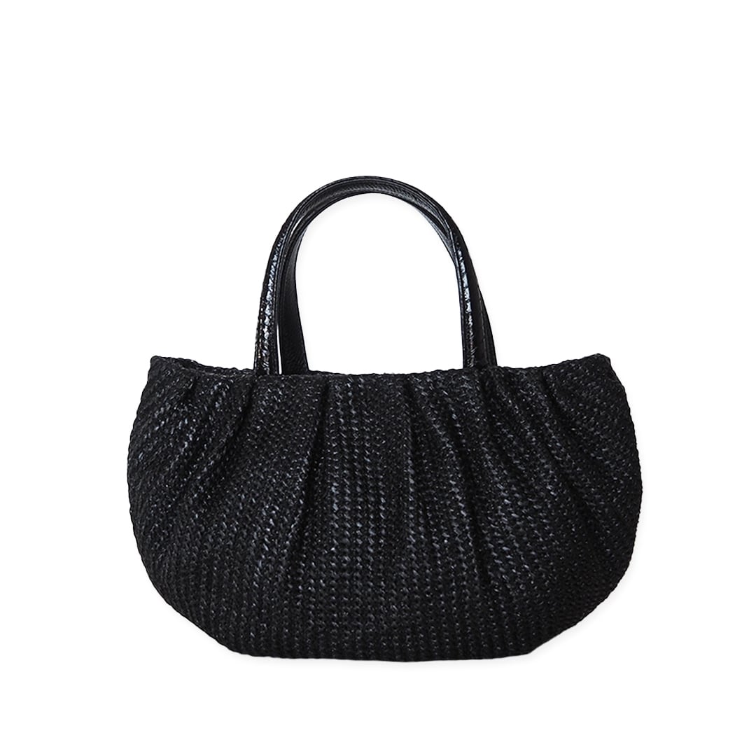 軽量の人工ラフィア素材(黒)に、ギャザーによる丸みと美しい立体感を持たせた2wayハンドバッグ。