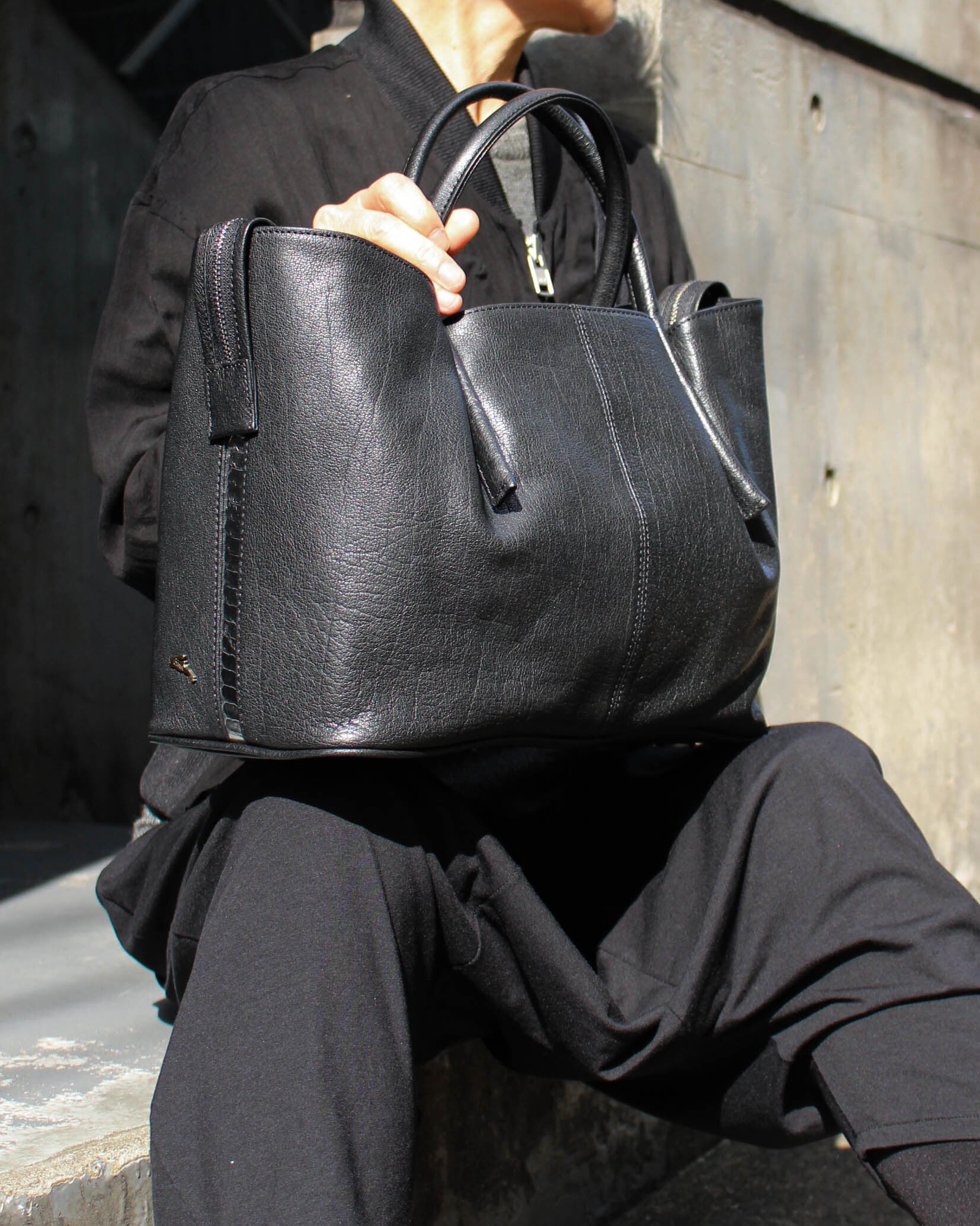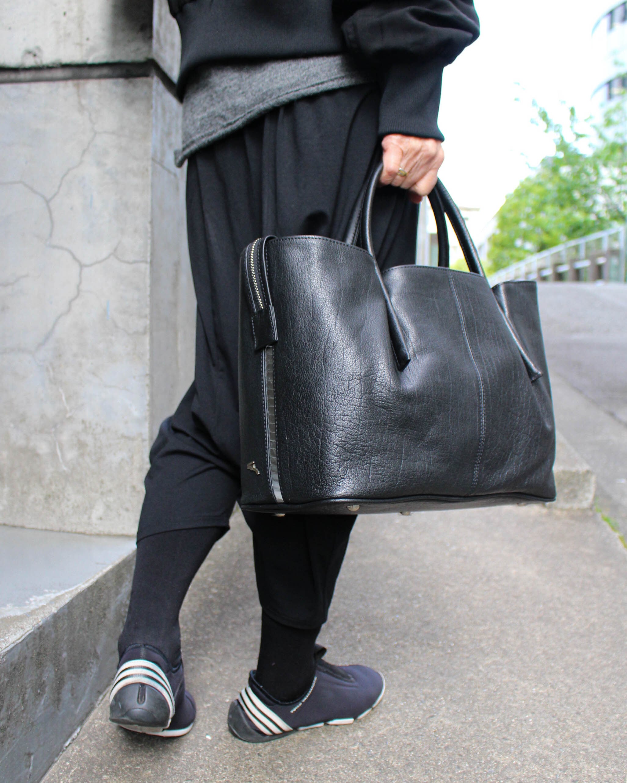 和服でも洋服でも持てるBag。しっかりと物が入るサイズもうれしい。サイドのきらりと光るヘビ皮革がおしゃれ。このデザインは、あおりポケットになっていて、メインのファスナーを長くすることで口の開きがよく使いやすい。本体はバッファロー(水牛の革)のシボが一つ一つ違う表情を見せてくれる。
