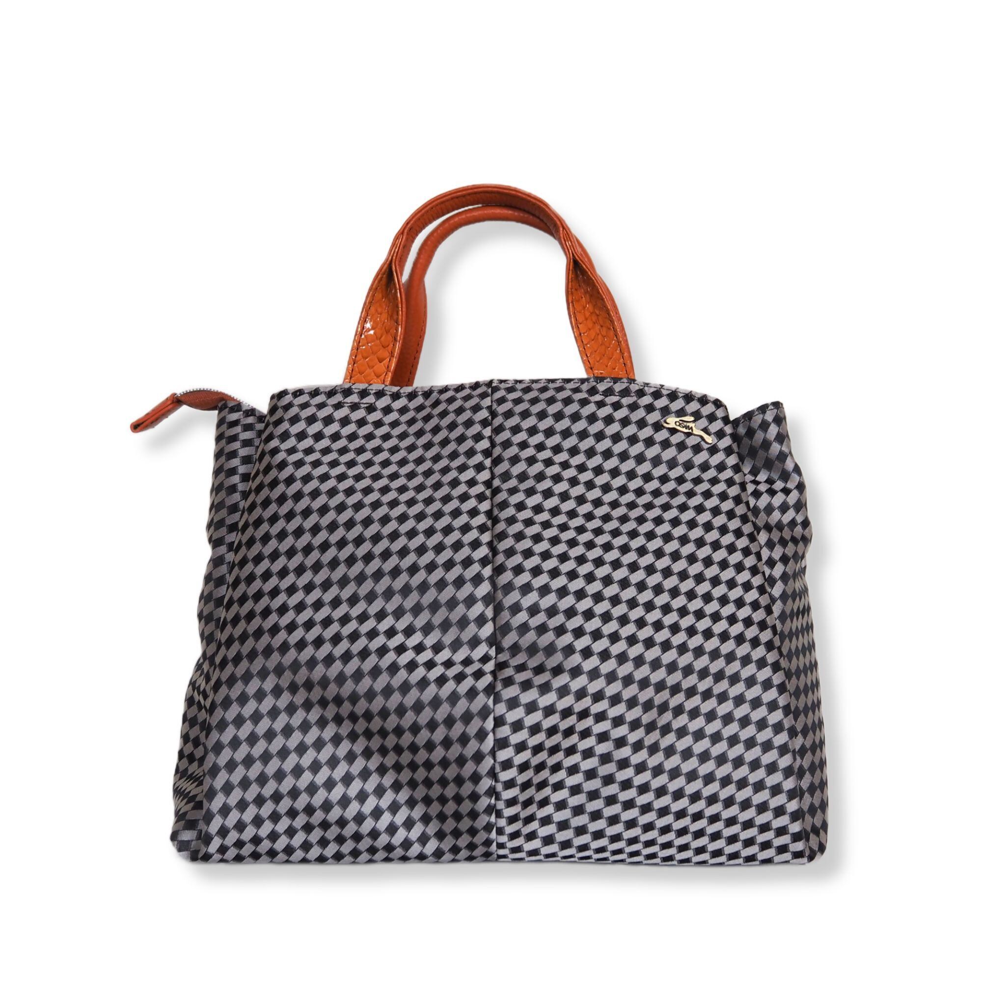 ジャガード織(メッシュ柄)のチャコールグレーとハンドル付け根近くにヘビ皮革のワンチャームがおしゃれな仕様となっています