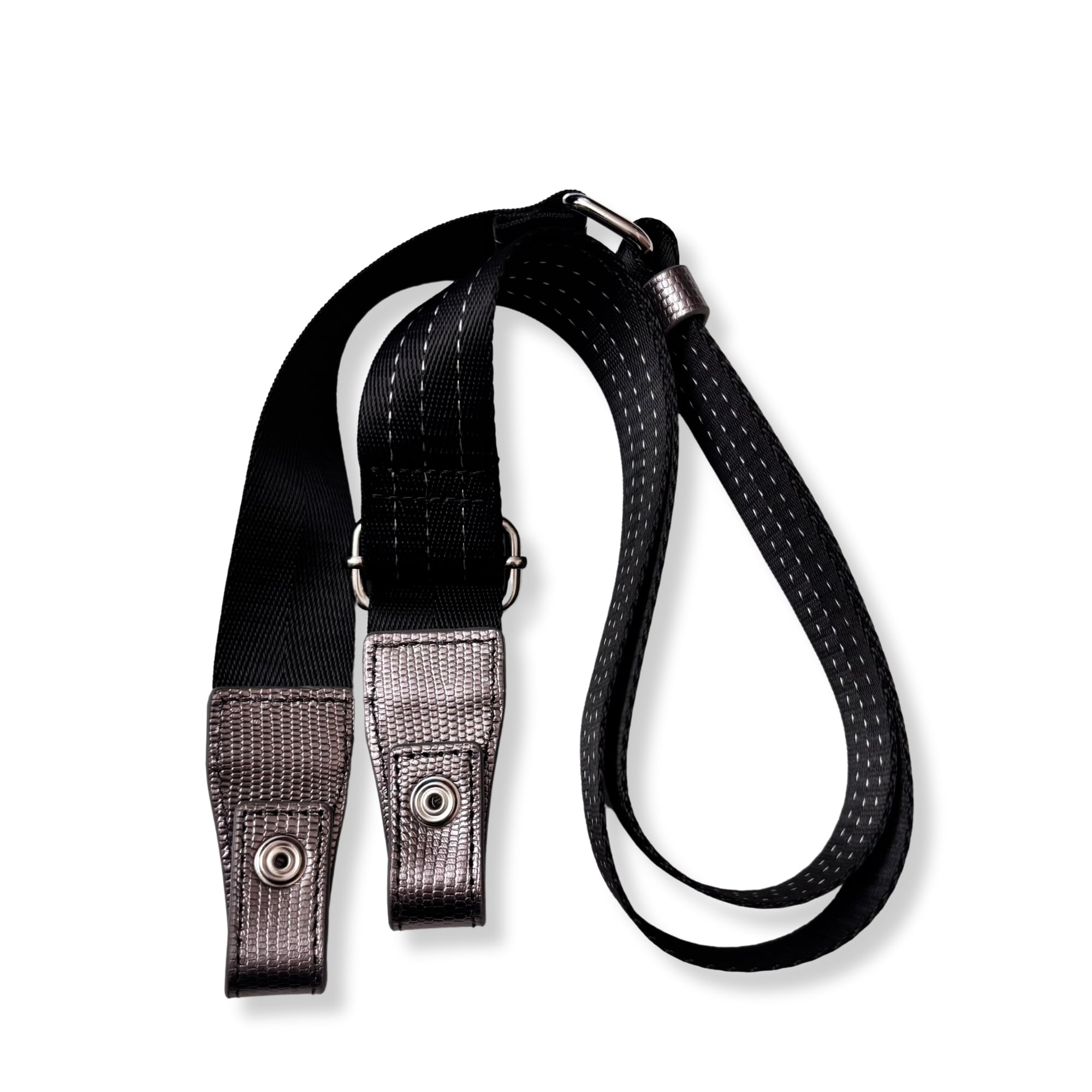 本体はさしこ風ポリエステル(ブラック)ファスナーみつけとチャームにリザード型押(牛革)を使用
